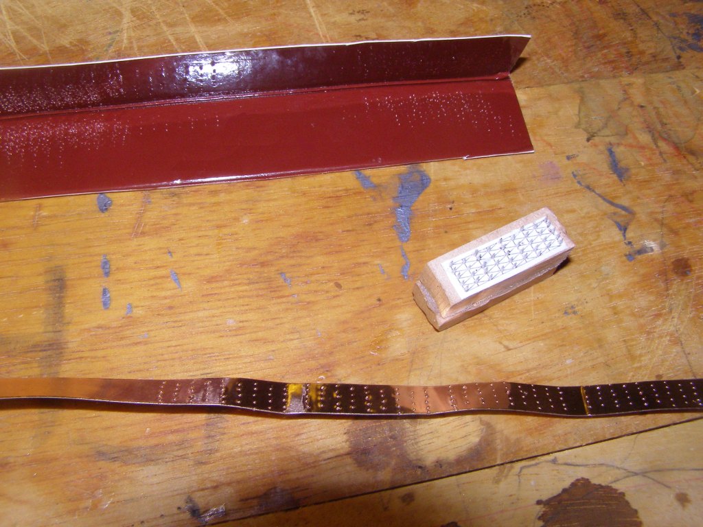 Do miedziowania kupiłem folie miedzianą, w sklepie z akcesoriami witrażowymi. Pasek miedziany szerokości 8mm, dokładnie taki jak potrzebowałem, grubości 0.025mm. Z tego co widzę robią tez grubsze i jak bym miał to robić drugi raz to kupiłbym 0.038mm. Moze byłaby mniej delikatna i lepiej by się wytłaczało gwoździowanie.