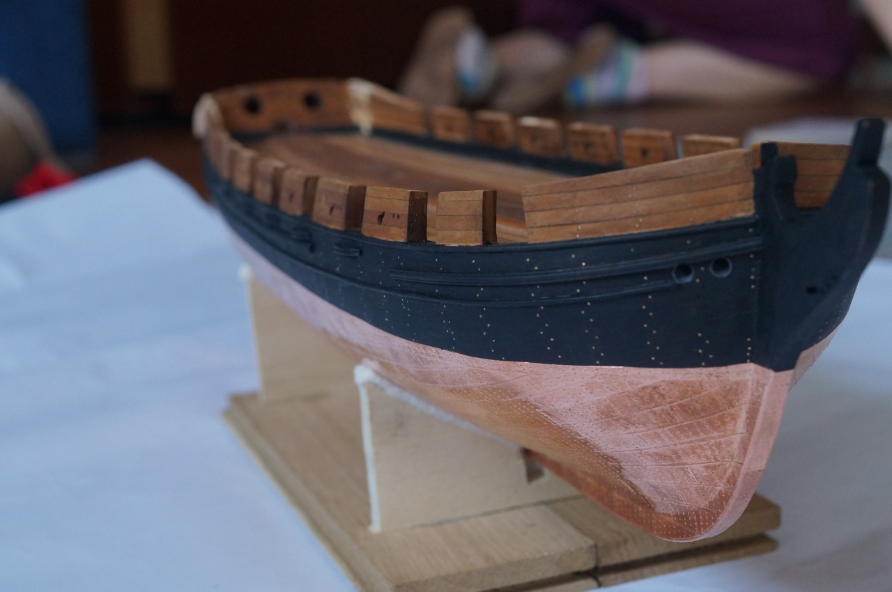 Miedziowanie. Pomimo, że właśnie takie rozwiązanie jest przedstawione w planach początkowo planowałem zostawić poszycie w naturalnym drewnie. Po przejrzeniu relacji Borka i jego Bellony zmieniłem zdanie.