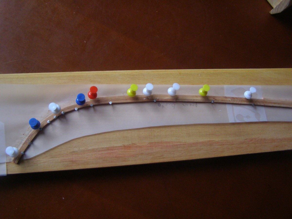 Zakończenia burt. Ponieważ nie miałem wystarczająco szerokiej listewki do wycięcia, musiałem składać to z kilku wyginanych na gorąco kawałków.