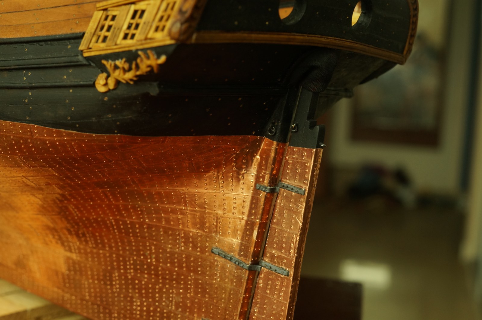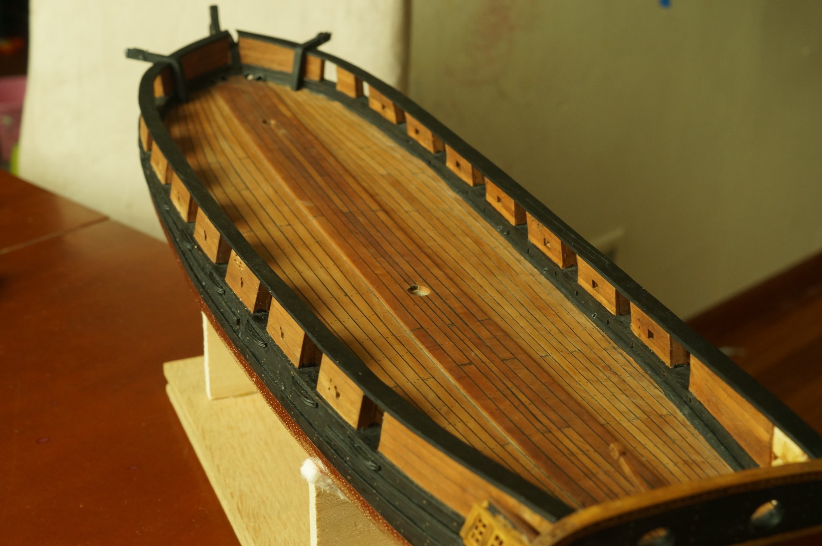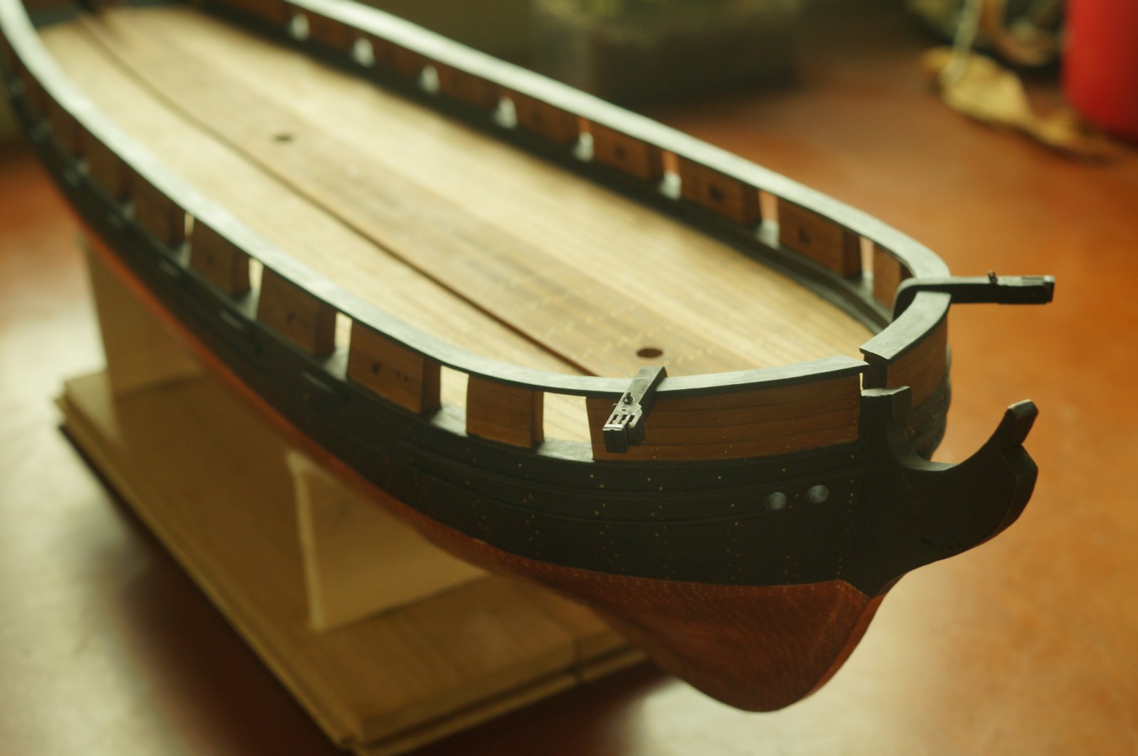 Rzeczywiście różnica jest spora, ale jak jest poprawniej? Na twoim zdjęciu nagle mają proporcje ~1:10, z czego część górna ta prawie połowa nagla. U mnie mają proporcje 1:6 i powyżej jest zaledwie 1/3 elementu. Stąd twoje wyglądają smuklej, a moje sa bardziej krępe. Może one różniły się zależnie od typu jednostki, albo epoki? W każdym razie ja będę trzymał się mojej dokumentacji. Inna sprawa to czy jest ona w 100% prawidłowa. Np obok zaznaczyłem otwór (prostokątny) na wiosło manewrowe, który koliduje ze schodami. Podobnie pod drugiej stronie burty. Wiosło miało ponad 9m długości i obsługiwane przynajmniej przez dwóch marynarzy. Jak oni przez taki otwór mieli machać tym wiosłem? W powietrzu? ;). Podobna sprawa z relingami na nadburciach, które moim zdaniem sięgają za daleko. Podobnie chyba sądził Bernard Frölich budując swojego La Cyclope i skończył je wcześniej. Ale nagle zrobił ściśle wg dokumentacji.