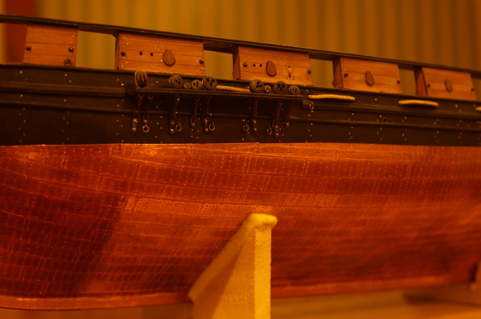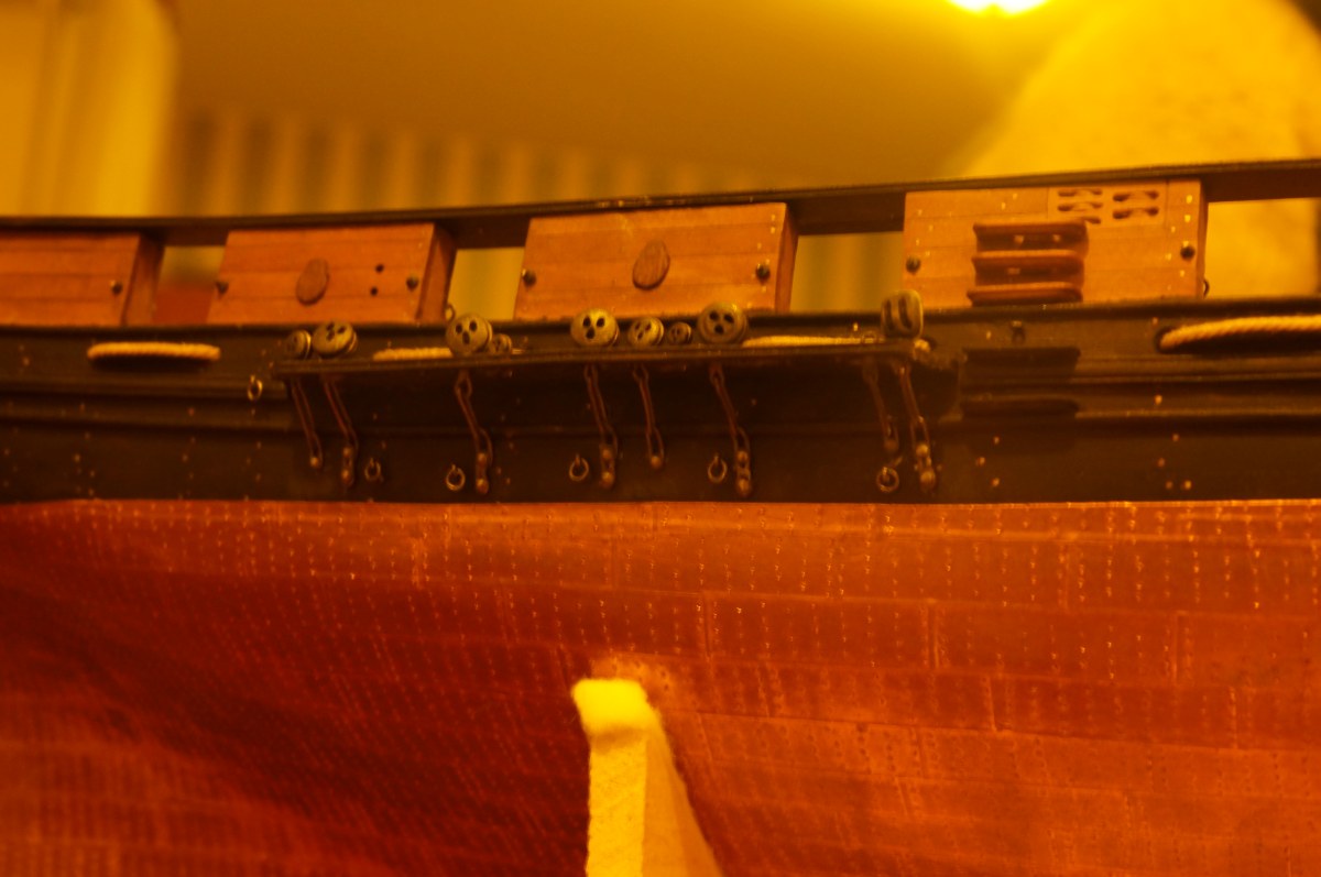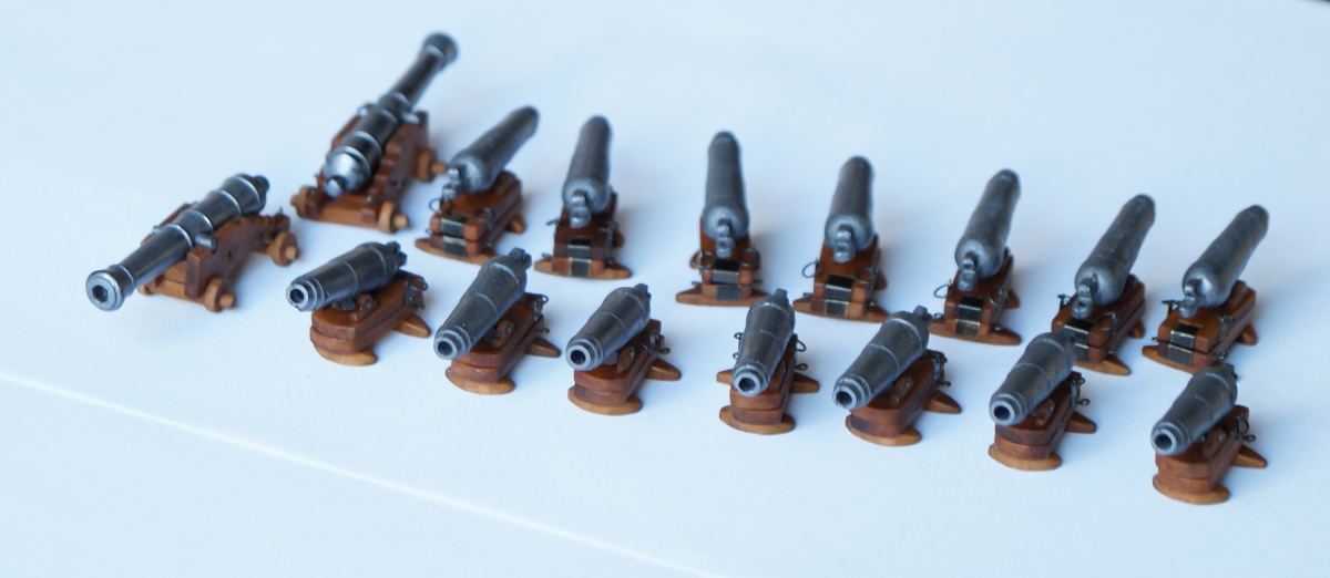 Armatki. Dwa działa 8-funtowe i 14 karonad 24 funtowych. Wzór karonady z bukszpanu, forma silikon Mold Star15, a odlewy z żywicy tej samej firmy. Po oczyszczeniu lufy pociągnąłem metalizerem żeby wyglądały jak z żelaza. Później trochę ściemnieją. Na razie wstępne spasowanie z lawetami.