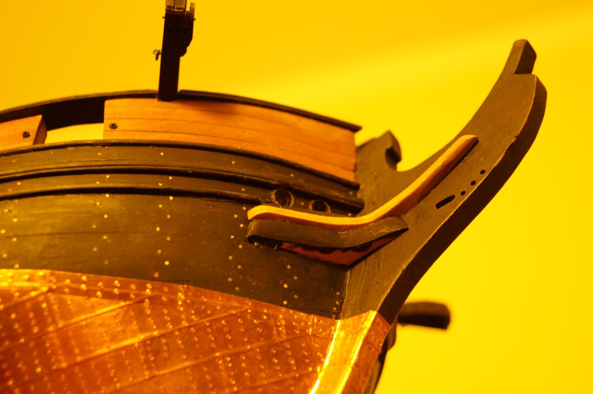 Początek zabawy z koszem dziobowym. Ponieważ górne "kły" powinny być po łuku, a robiłem je z jednego kawałka, to po krótkim podgrzaniu w gorącej wodzie musiałem je wygiąć jak pokazano na zdjęciu.