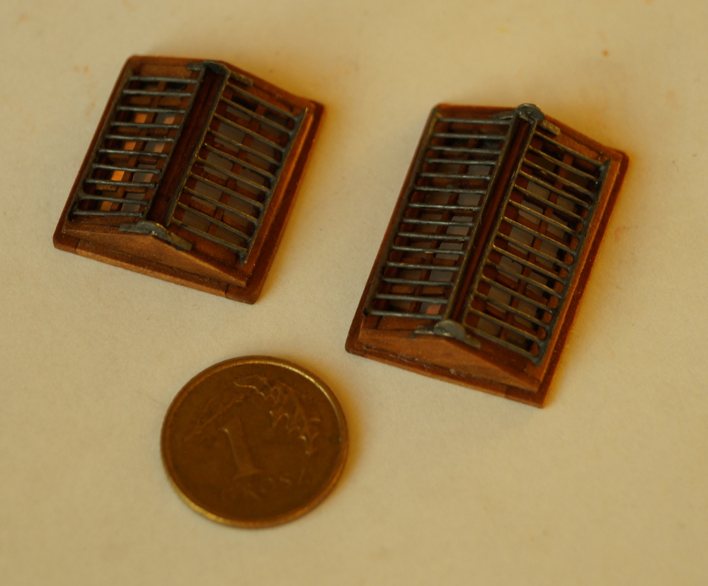 Ruszt (?) zabezpieczający szyby zrobiony z drutu 0.4mm i płaskownika gr.0.3mm. Ponacinałem listewke w odstępach równych rozmieszczeniu pretów, a nastepnie przykleiłem je klejem CA. Same druciki były z naddatkiem. Dzieki temu po wyschnieciu kleju mozna je było wszystkie równo dociąć i przylutować płaskownik. Później w acetonie ładnie to się od listewki odklei. Po krótkich konsultacjach na forum postanowiłem wspomóc się pastą Amasan LF 3. Bez niej bym tego nie zlutował i tylko żałuję , że nie miałem jej wczesniej.