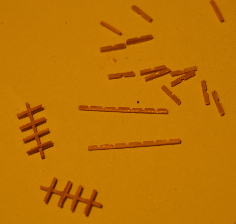 Szprosy okienek mają ok. 0.6mm grubości. Po kilku podejściach stwierdziłem, że najlepiej wychodzi, jak się wcześniej ponacina listewkę w miejscach przecięcia szprosów, a później je same poodcina na odpowiednią grubość. Sklejane ze sobą na papierze przykleiły się do niego co zapewniło chwilową sztywność i można je było od góry wyrównac pilnikiem, a później papier usunąć.