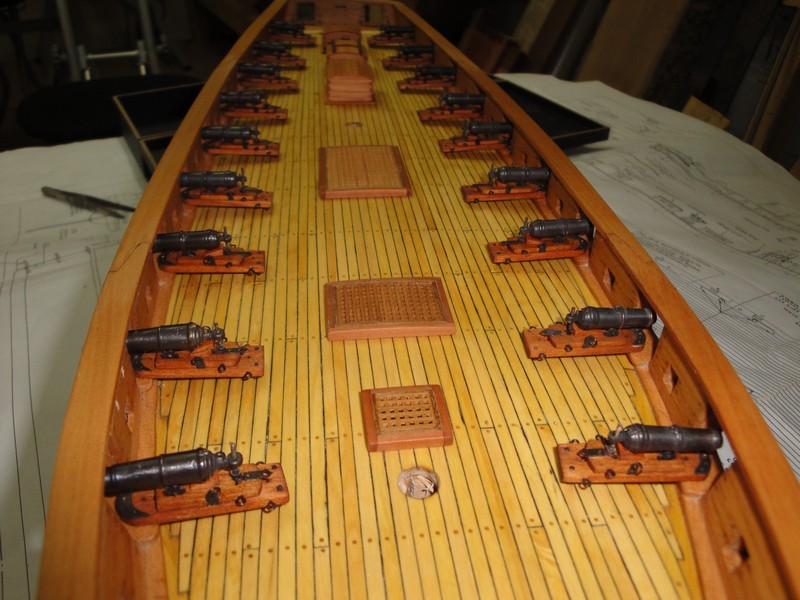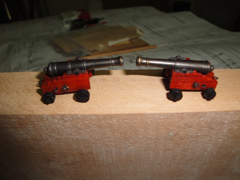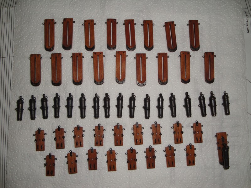 Po zlozeniu i sklejeniu dwoch dzial, uzbrojenie Niagary jest zakonczone. Lawety z czerwonego drzewa "red heart", jakby inaczej, CNC od Mirka. Lufy z Polski od rbmodel.com. Kola czernione tuszem kreslarskim. Przy czernieniu chemicznym wiekszych elementow (np lufy) nastepujace kroki: wstepne oczyszczenie mechaniczne przy pomocy welny/waty stalowej (gospodarstwo domowe-czyszczenie garnkow), nastepnie odtluszczanie-aceton, mycie woda, czernienie roztworem kwasu selenowego (1:1 z woda)10-15sek, mycie woda, suszenie, lekkie polerowanie np. flanela z ev. dodatkiem proszku grafitowego. Przy mini-elementach odpada krok pierwszy i ostatni. I to juz chyba wszystko. Praktycznie zlozylem do kupy gotowe elementy jak z zestawu, troche poglaskalem, pociagnalem olejem lnianym, i tak to wyszlo.