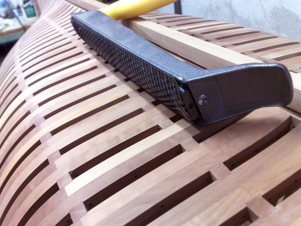 Wręgi są przyklejone, denne wzmoniemia międzywręgowe też są wklejone, a gumki to ciągle jeszcze stsbilizują. Hebelkami wolę wyrównywać niż kostką z grubym papierem ściernym. Po nich wystsrczy bardzo drobnym, zbierają po ok.0, 05 mm czyli niewiele. Skosy są już wyszlifowane wałkiem ściernym.