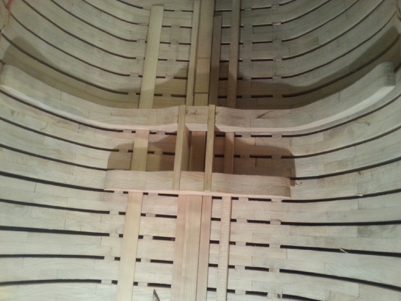 Dziś szlifowałem wnętrze kadłuba oraz wkleiłem nadstępkę.Model pierwszy raz opuścił stocznię.Nie było najmniejszych problemów.Po usunięciu trocin powrócił do niej również bez problemów.Do szlifowania została zewnętrzna powierzchnia wręg.