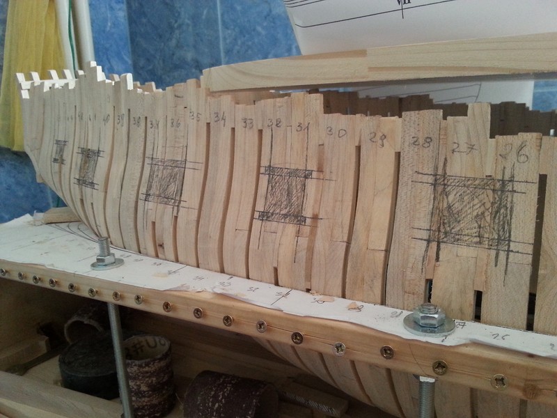 Wykreśliłem na burtach linie pod otwory na furty działowe.