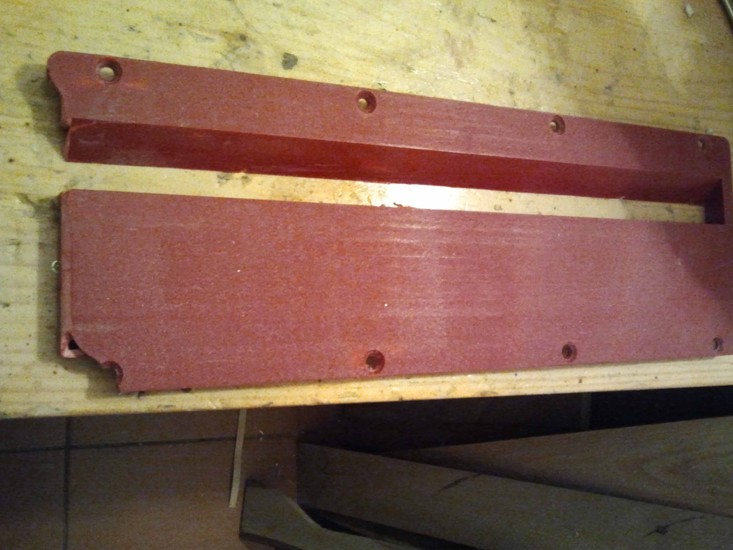 Przy cięciu listew na wręgi wyszły niedoskonałości piły tarczowej 'made in China'.Pod wpływem wibracji zaczęła pękać wkładka z tworzywa sztucznego.Dorobiłem podobną z blachy duralowej grubości 4 mm.Teraz tnie idealnie,nie ma porównania z plastikiem.