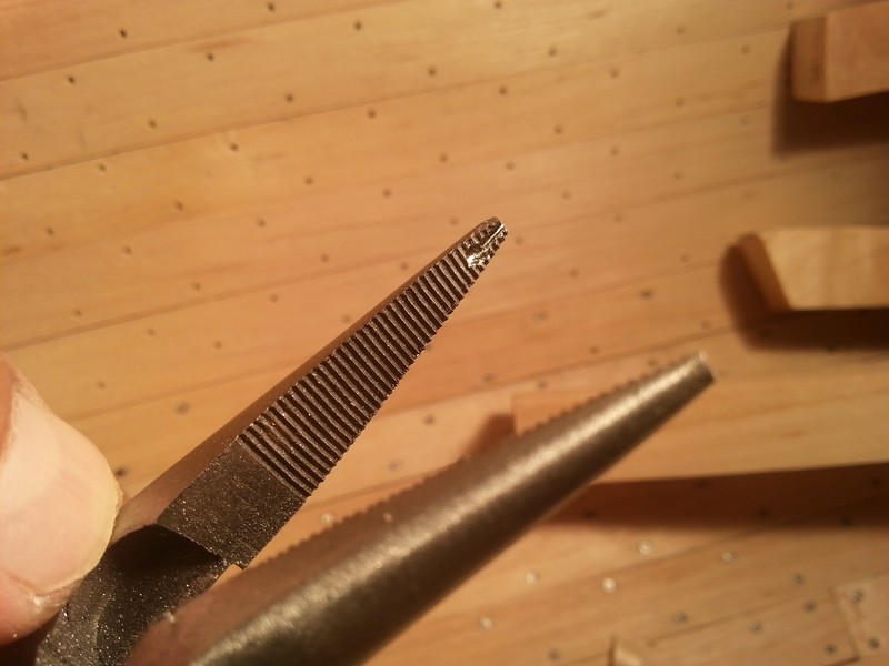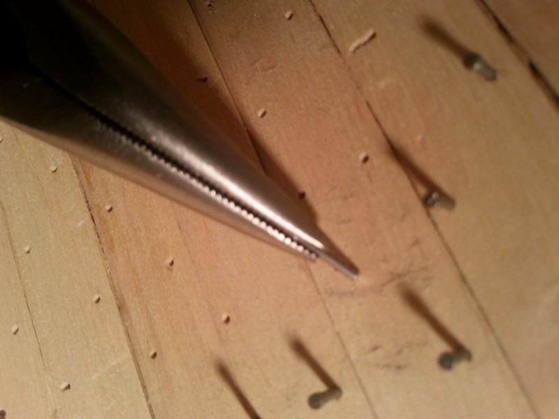 Salamandra w stoczni,a ja zajmuję się gwoździowaniem. Do wciskania gwoździ w wywiercone otwory zmodyfikowałem kleszczyki.