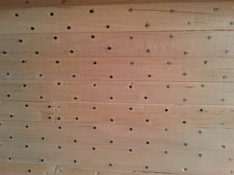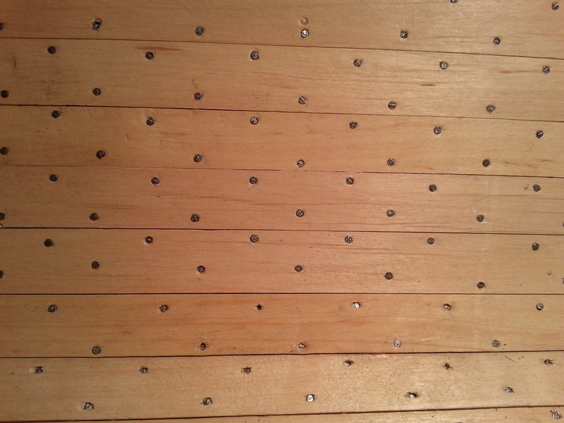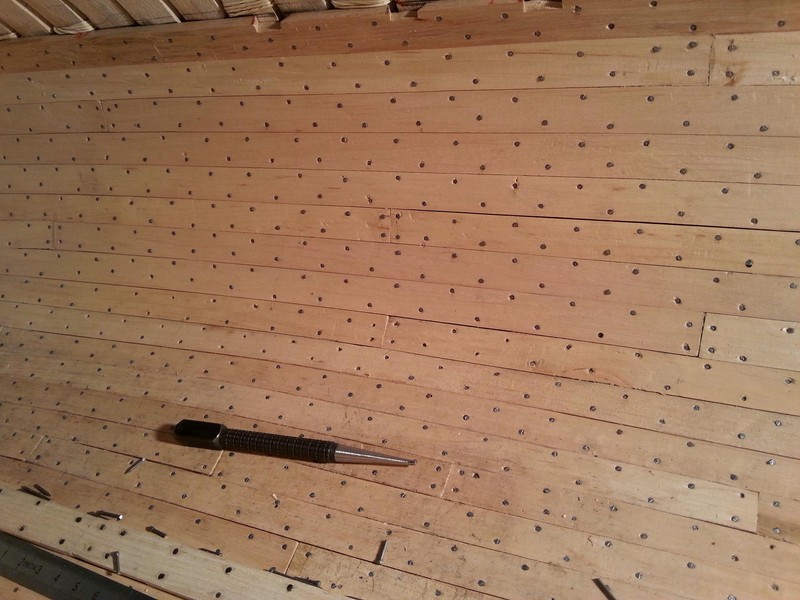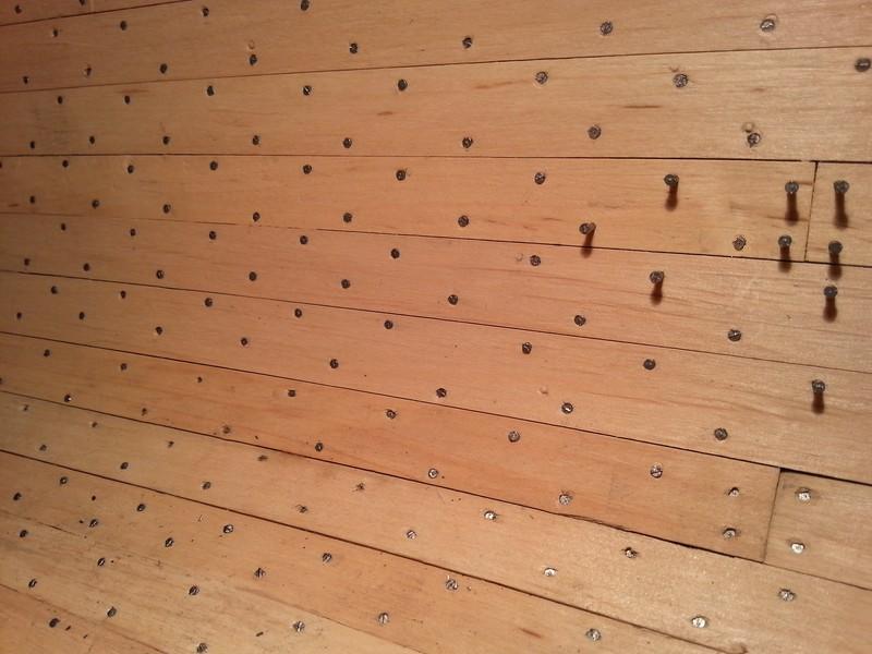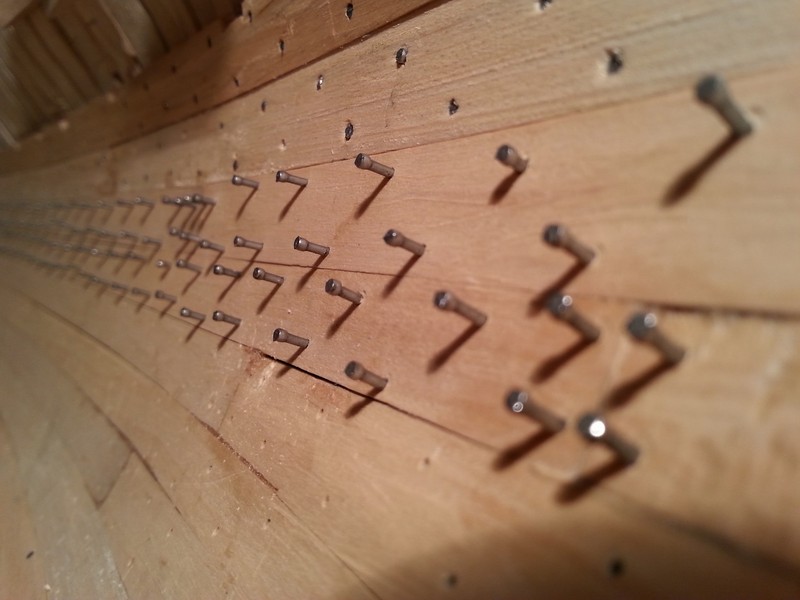 Zakończyłem bicie gwoździ w poszycie wewnętrzne. Mały fragmencik delikatnie przeszlifowałem i poczerniłem, ale efekt jeszcze mnie nie zadowala.