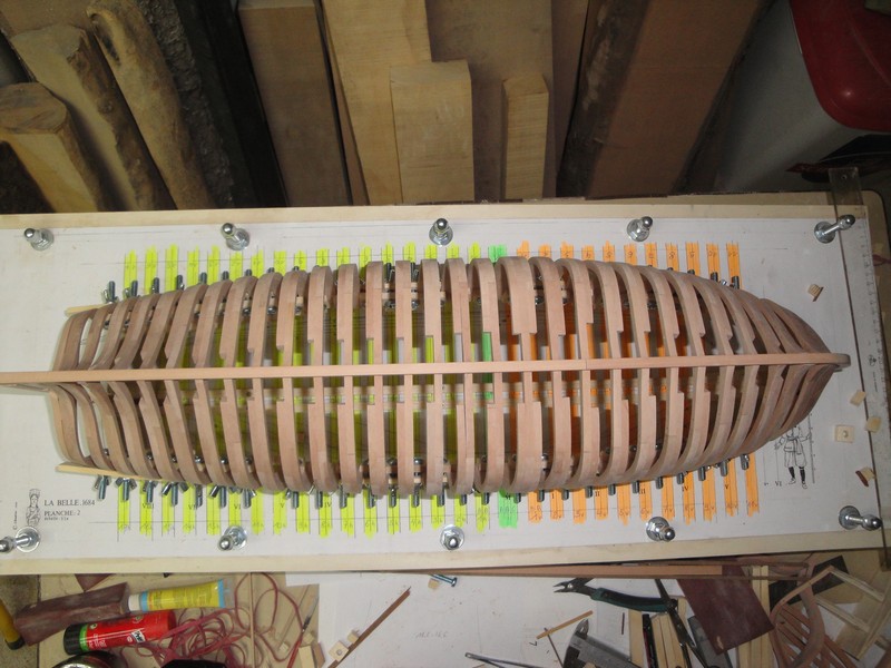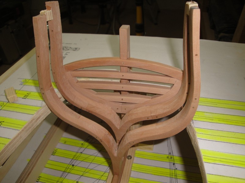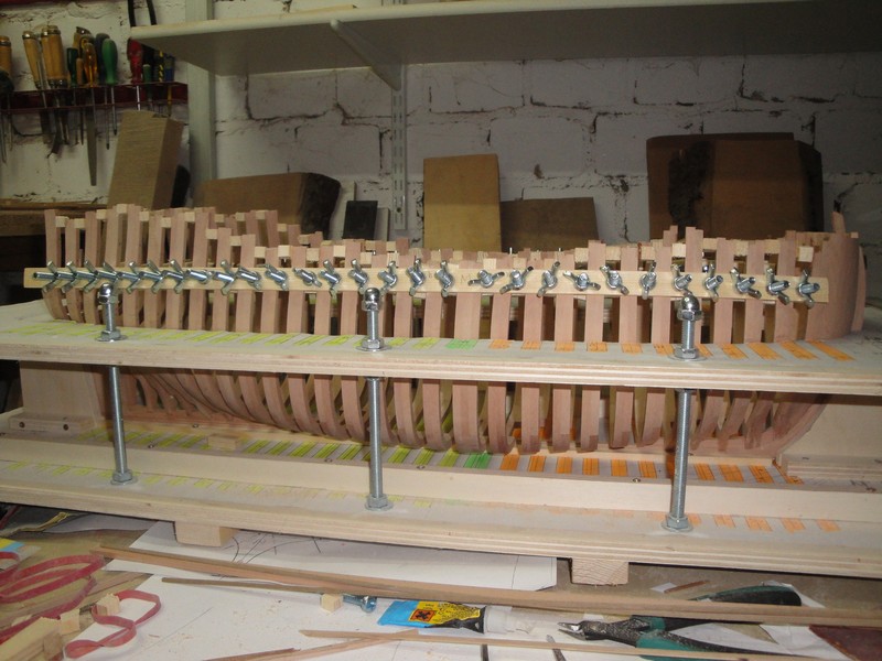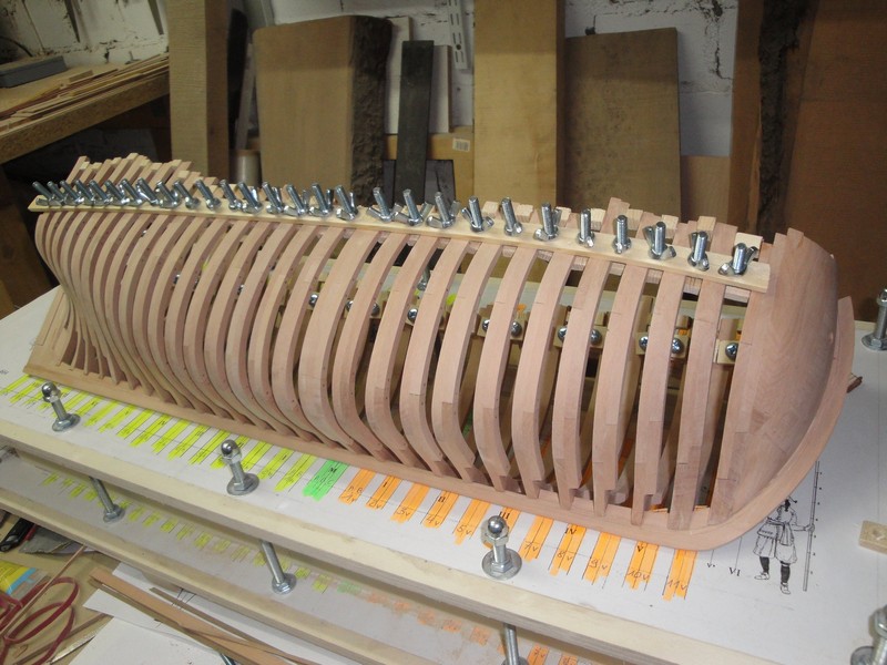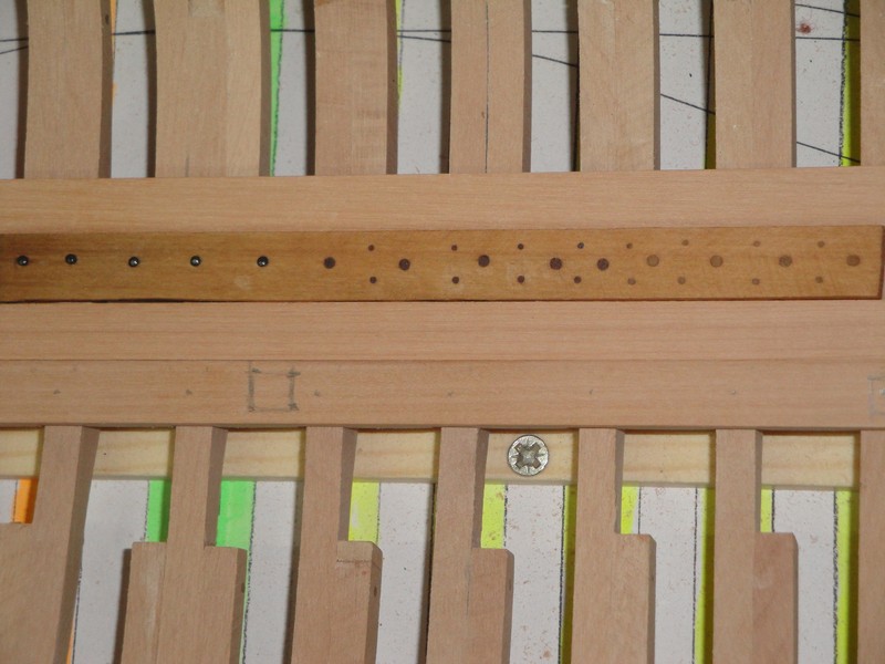 Dieki za uwagi i komentarze. Zabralem sie za wsporniki pod pokladniki (deski 9x3mm) oraz poszycie wewnetrzne (9x1,5mm). Stan surowy (slady kleju, nierownosci desek) bo wszystko po kolkowaniu bedzie i tak szlifowane. Pozycja otworow pod kolki zaznaczona olowkiem, jeszcze nie wywiercone.