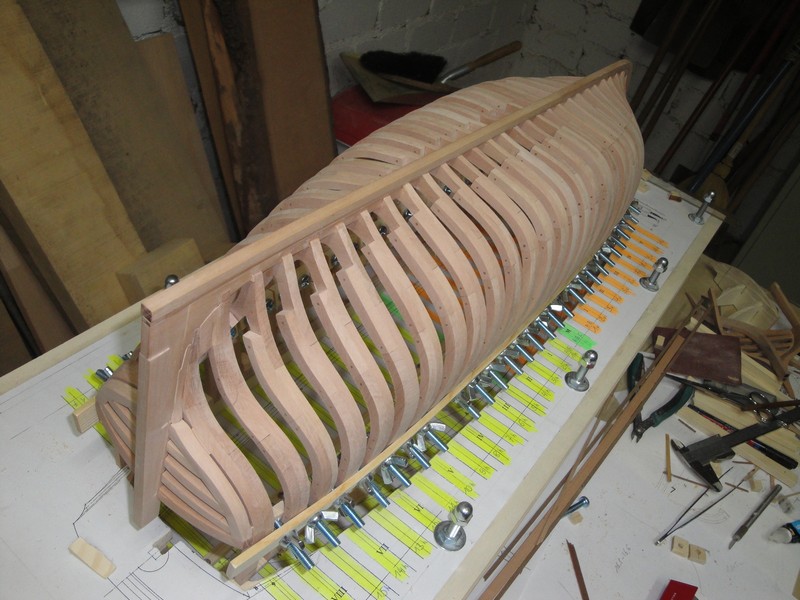 Dieki za uwagi i komentarze. Zabralem sie za wsporniki pod pokladniki (deski 9x3mm) oraz poszycie wewnetrzne (9x1,5mm). Stan surowy (slady kleju, nierownosci desek) bo wszystko po kolkowaniu bedzie i tak szlifowane. Pozycja otworow pod kolki zaznaczona olowkiem, jeszcze nie wywiercone.