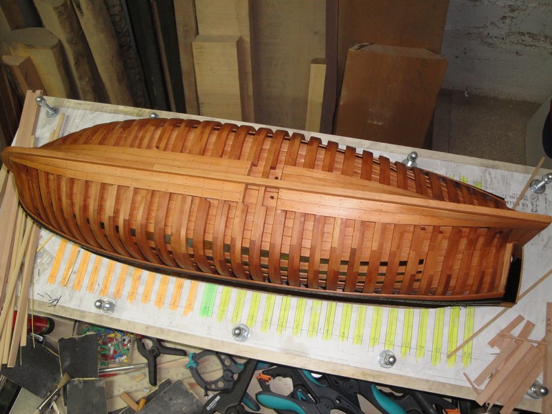 Skonczylem poszycie wewnetrzne i zewnetrzne. Jak widac na zalaczonych fotkach nie bedzie to model w konwencji admiralskiej ale tez nie calkowicie poszyty. Zdecydowalem sie na rozwiazanie posrednie, zeby moc pokazac mozliwie duzo wnetrza oraz wregi. Caly model zostal pokryty olejem lnianym.
