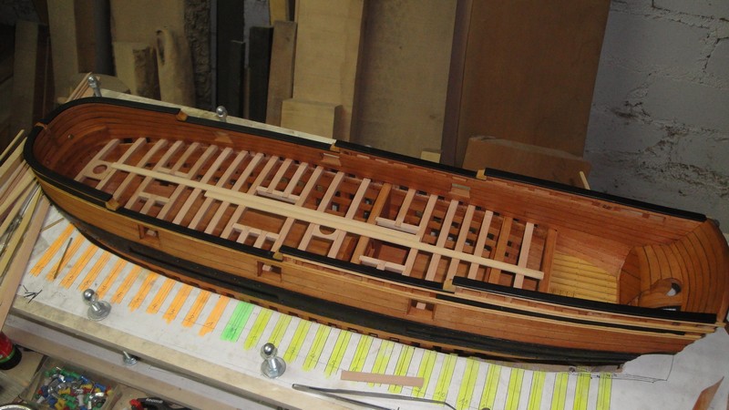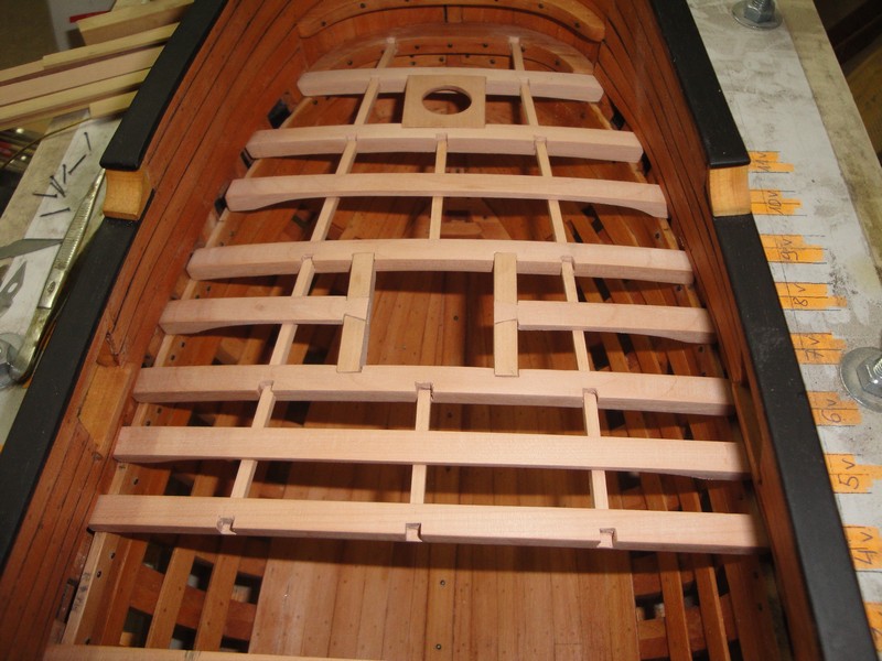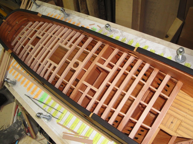 Wycialem i dopasowalem komplet pokladnikow. Pierwsza przymiarka na sucho. Trzeba jeszcze wystrugac poprzeczne elementy laczace i wsporniki pokladnikow.