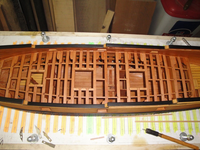 Po krotkiej przerwie spowodowanej urlopem, przyszla kolej na klejenie konstrukcji pokladu. Wsporniki pokladnikow zostaly wyciete (CNC-dzieki Mirku) i dopasowane do profilu kadluba.