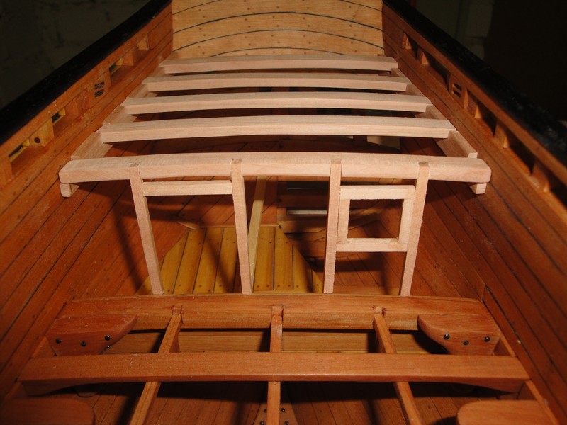 Przyszla kolej na kabine kapitanska. Zamocowalem pokladniki i skleilem scianke dzialowa. Drzwiczki sa stosunkowo niskie (ca 1m) ale nic na to nie poradze (tak jest na planach, na wiecej nie ma miejsca). Trzeba sie mocno schylac wchodzac do kabiny. Tyle na temat rozbierznosci miedzy planami i rzeczywistoscia. W miejscu styku scianki z burta przyjdzie jeszcze listwa dekoracyjna. Szczelina pod scianka przeznaczona jest na deski pokladu.