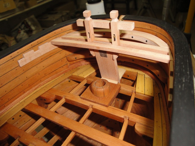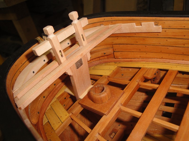 Przyszla kolej na deskowanie pokladu. Na poczatek, po dwie deski przy burtach (bukszpan, 1,8x8mm) oraz waterway, prza dziobie deskowanie tylko zaznaczone. Doszedl tez szkielet nadbudowki dziobowej (jeszcze nie klejona bo trzeba bedzie dopasowac pacholki).