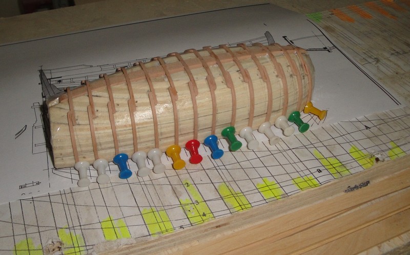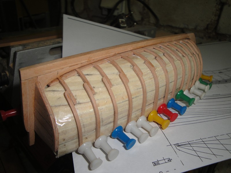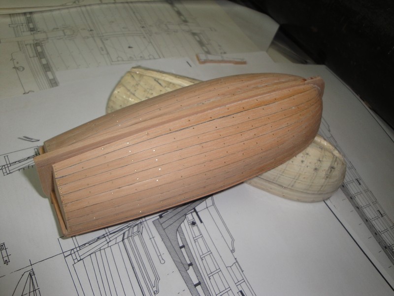 Szalupa dostala poszycie (5x1,5mm). Kolkowalem w trakcie kladzenia poszycia, zeby lepiej trafic w poszczegolne wregi (drut mosiezny 0,5mm).