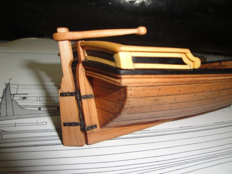 No to zrobilem ster i wystrugalem wiosla. Okucie steru z blaszki mosieznej 0,3mm, nity 0,5x3mm, srednica glowki 0,8mm, czernione jak zawsze kwasem selenawym. Wiosla maja dlugosc 12cm.