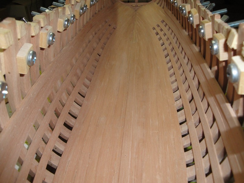 Dieki za uwagi i komentarze. Zabralem sie za wsporniki pod pokladniki (deski 9x3mm) oraz poszycie wewnetrzne (9x1,5mm). Stan surowy (slady kleju, nierownosci desek) bo wszystko po kolkowaniu bedzie i tak szlifowane. Pozycja otworow pod kolki zaznaczona olowkiem, jeszcze nie wywiercone.