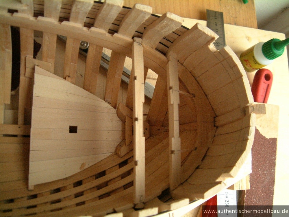 Ja nie twierdze, ze nie wykonywano najpierw poszycia wewnetrznego. To nie o to chodzi. Ten wspornik pod pokladniki jest w La Belle (podobnie jak i w innych jednostkach, np. Granado) przybijany bezposrednio do wreg (moze byc traktowany jako czesc poszycia) i dopiero na ten wspornik przychodza pokladniki i tez to dziobowe wzmocnienie. NA wspornik a nie z boku do wspornika, jak twierdzil Mati. Tak to robia inni modelarze i tak mi to mowia plany, jesli je dobrze interpretuje.