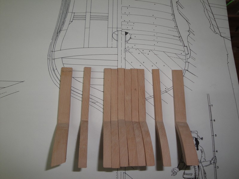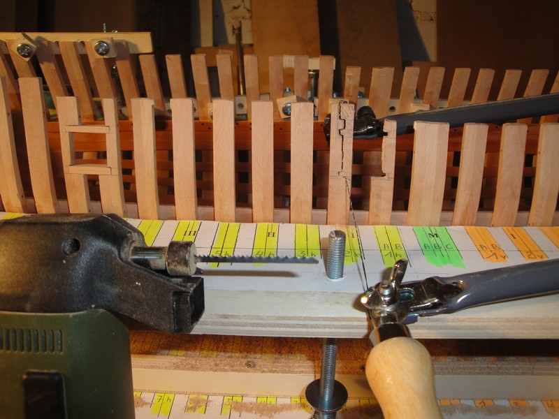 Amputowalem konce wreg wedlug planow po kilkukrotnych przymiarkach uzywajac do tego celu mini-wyrzynarki Proxxona. Wyznaczylem i wycialem luki dzialowe przy pomocy laubzegi ze spiralnym brzeszczotem. Wykonczylem wstepnie oramowanie luk (jeszcze nie poklejone ). Tak na marginesie maly dodatek do dyskusji o rozmieszczeniu tych luk dzialowych na burtach. La Belle ma tylko trzy po kazdej stronie. Przy wyznaczaniu pozycji tych luk, stwierdzilem ze odleglosci pomiedzy nimi wcale nie sa rowne