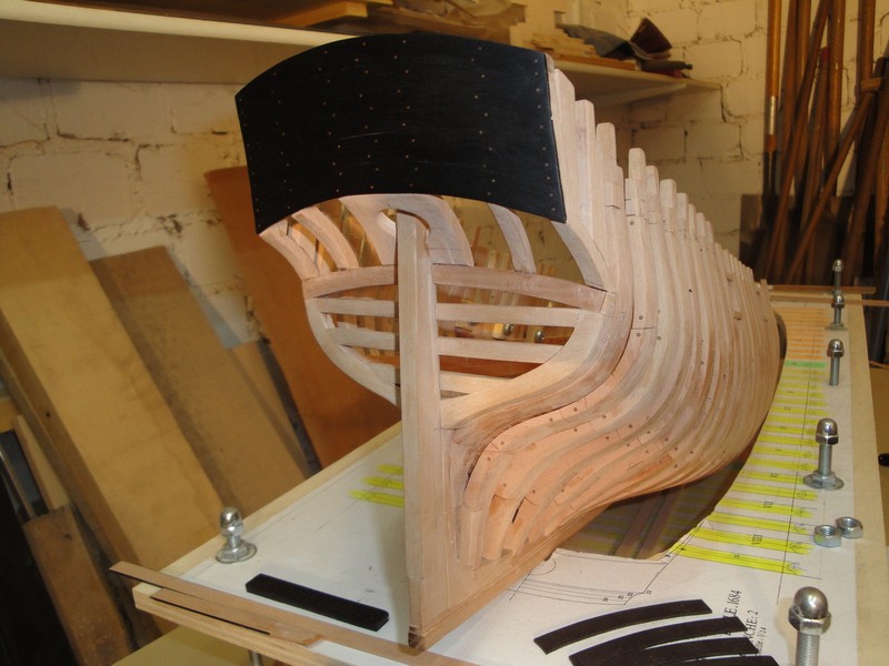 zabralem sie za pokrycie rufy. Gorna czesc jest czarna wiec uzylem hebanu. Przy pomocy szablonu wycialem odpowiednio wygiete listwy. Nie musialem zwracac uwagi na sloje, bo przy hebanie ich nie widac. Kolkowanie 0,8mm brazowym bambusem.