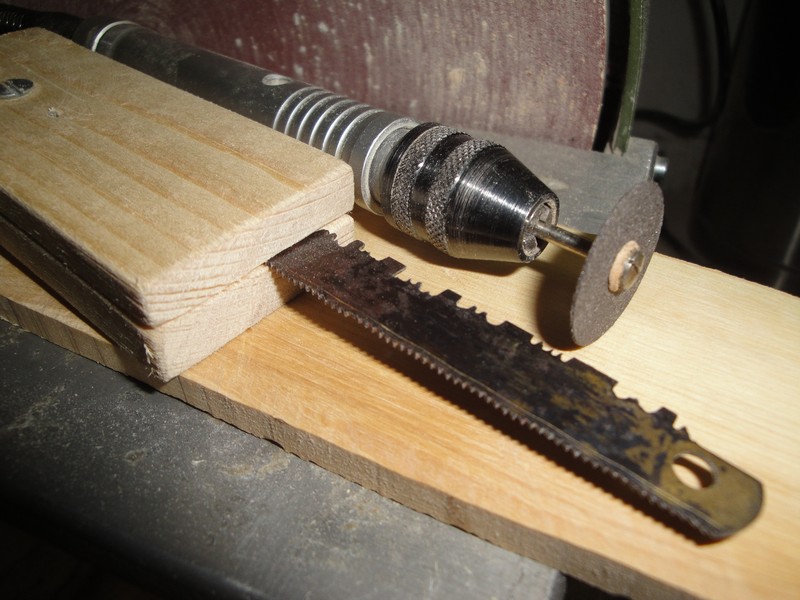 Przyszla kolej na listwy ozdobne na zewnetrznych burtach. Przy pomocy korundowej sciernicy tarczowej (D=22mm, grubosc 0,7mm) wycialem w brzeszczocie pilki do metalu "szablony" (metoda na pewno jest ogolnie znana, ale gwoli scislosci zamieszczam kilka zdjec) ktorymi wyskrobalem odpowiednie profile (szerokosc 4mm, grubosc 2,5mm).