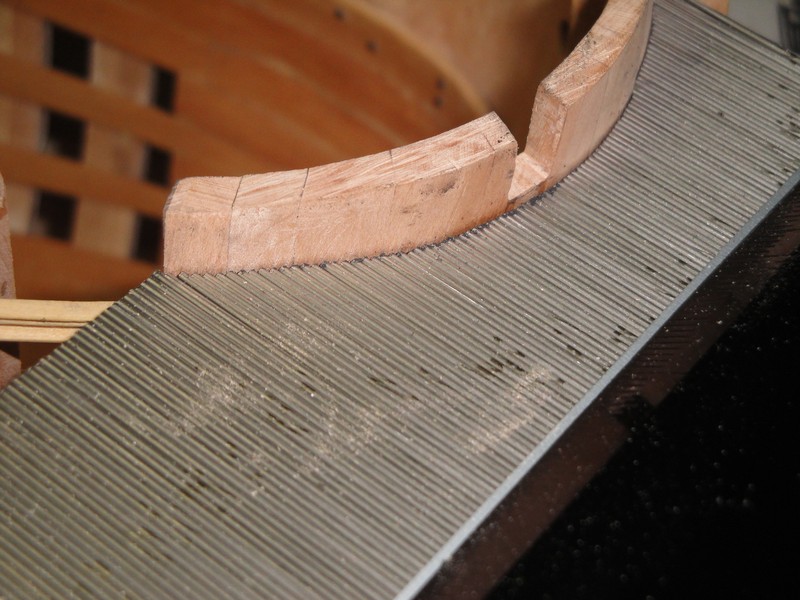 Wyprobowalem nowa zabawke, szablon do krzywych profili. Dziob ma za duza krzywizne, zeby listewke hebanowa, 1,5mm grubosci odpowiednio wyprofilowac. Przenioslem ten luk na heban 10mm grubosci, i wycialem z pelnego materialu odpowiedni profil. I co powiecie, pasowal do burty dziobowej.