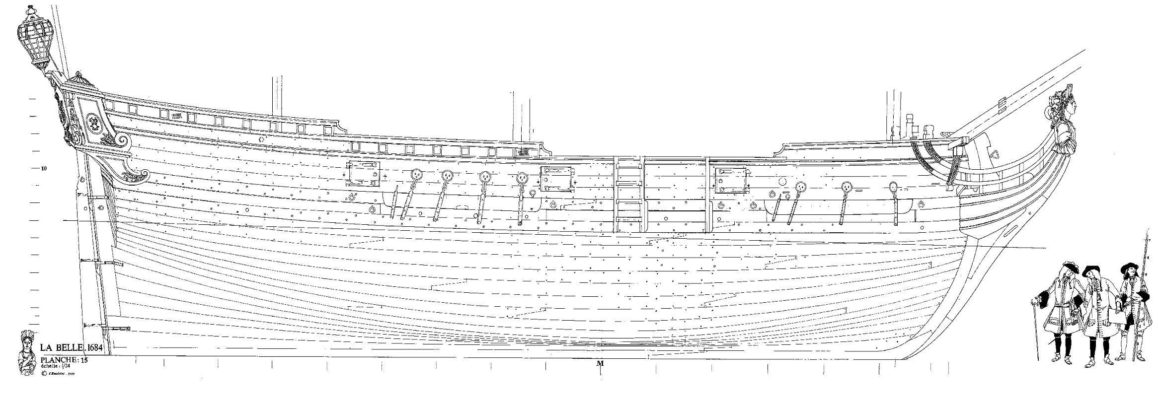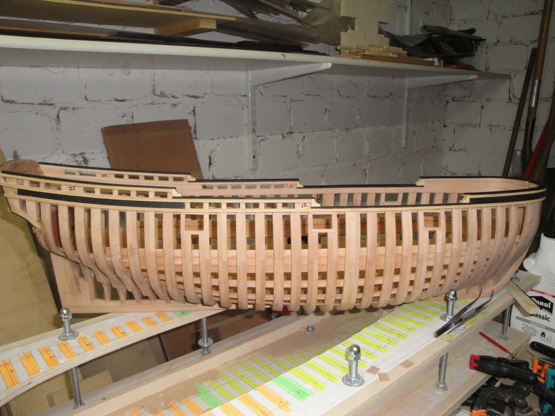 Przede wszystkim dziekuje za uwagi i uwazne sledzenie relacji. Na planach, trzy gorne planki powyzej odbojnicy sa z jednego kawalka drewna. LB, pomimo ze byla mala jednostka, miala ok. 15m dlugosci (od dzioba do rufy). Nie jest mi znane, zeby do budowy uzywano takich dlugich desek (przecietnie ca 6m), czyli jakies polaczenia musialy byc. Wszystkie planki ponizej odbojnicy sa laczone. Tyle na temat planow.