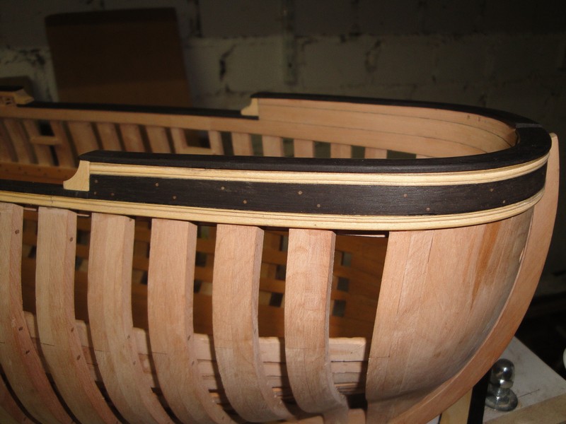 Ciag dalszy prac przy zewnetrznych burtach: gorne poszycie i odbojnice. Dla proby, czesc pokrylem olejem lnianym.