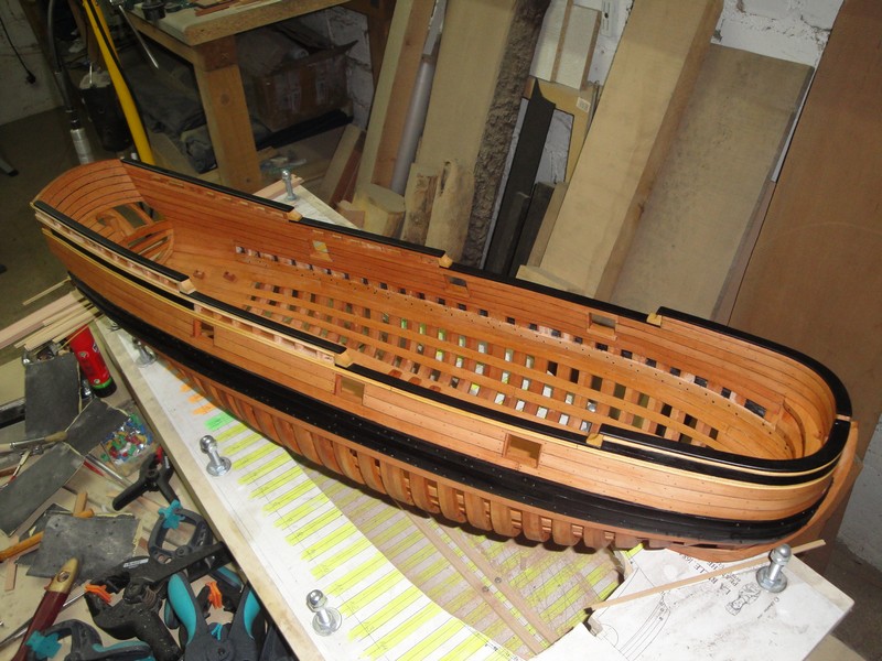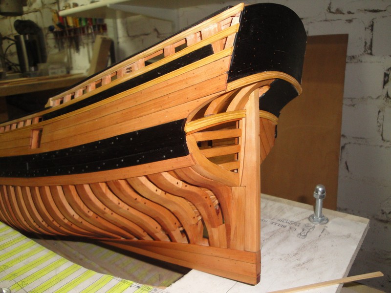Skonczylem poszycie wewnetrzne i zewnetrzne. Jak widac na zalaczonych fotkach nie bedzie to model w konwencji admiralskiej ale tez nie calkowicie poszyty. Zdecydowalem sie na rozwiazanie posrednie, zeby moc pokazac mozliwie duzo wnetrza oraz wregi. Caly model zostal pokryty olejem lnianym.
