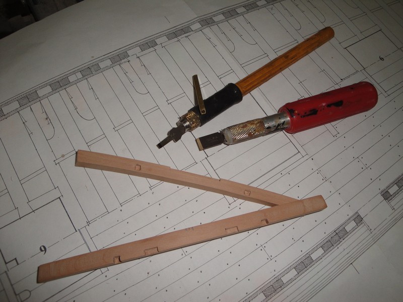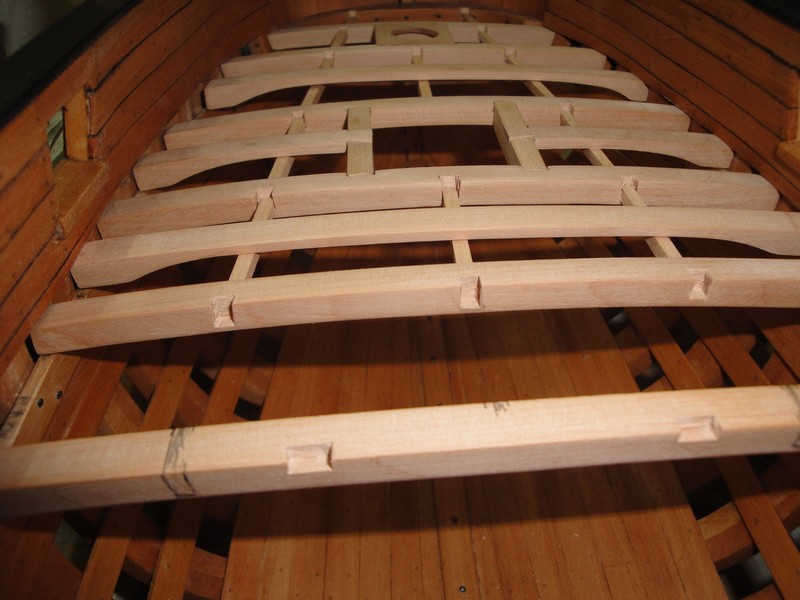Ciag dalszy konstrukcji pokladu. Otwory do zamocowania belek laczacych pokladniki wycialem skomplikowanymi narzedziami: ostrza dlutowe OLFA (czesciowo zmodyfikowane-redukcja szerokosci ) oraz kwadratowy profil z zaostrzonym koncem. Cala konstrukcja na razie na sucho do dopasowania.