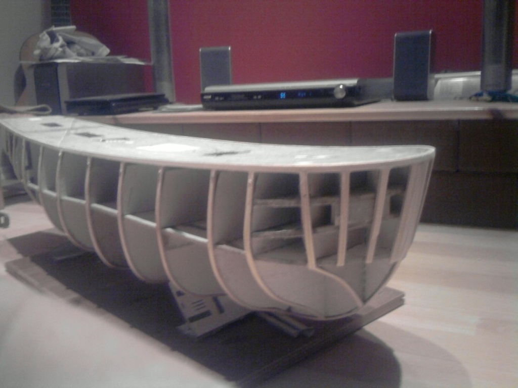 W zasadzie zgadzam sie z odpowiedzia kol. Kazka. Z tym, ze ja jednak zaczalbym model od nowa, i tym razem na szkielecie ze sklejki zamiast z tektury, dodajac jednoczesnie wiecej wreg (grodzi). Zwlaszcza przy tej skali (wielkosci modelu), dobrze jest miec szkielet sztywny, mocny, idealnie symetryczny i bez wypaczen. Jesli dodasz wiecej wreg (dodaj po jednej ekstra miedzy juz istniejacymi), oraz jakies dodatkowe elementy usztywniajace (grubsze listwy idace z obu stron kadluba po bokach od kilu, wewnatrz jego ozebrowania) , szkielet powinien byc wystarczajaco sztywny.