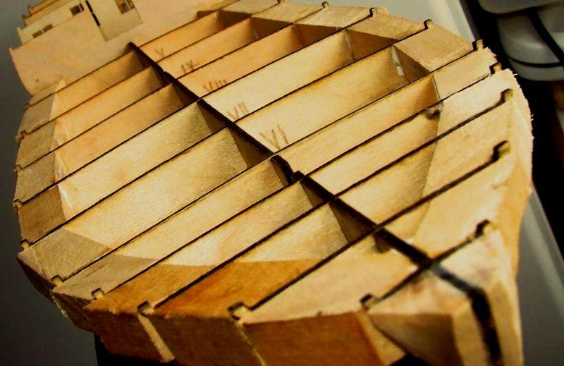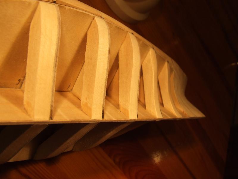 Przed sklejeniem calego szkieletu, zloz go na sucho i sprawdz czy wszystko jest OK, zwracajac uwage na symetrycznosc kadluba i jego plynnosc, tj. za pomoca listewki przylozonej do kilku sasiadujacych ze soba wreg, upewnij sie ze nie ma na jej biegu zapadniec czy garbow na krawedziach wreg. W ten sposob sprawdz dokladnie caly kadlub. Ewentualne garby spiluj, a zapadniecia podklej krotkimi odcinkami listewek.
