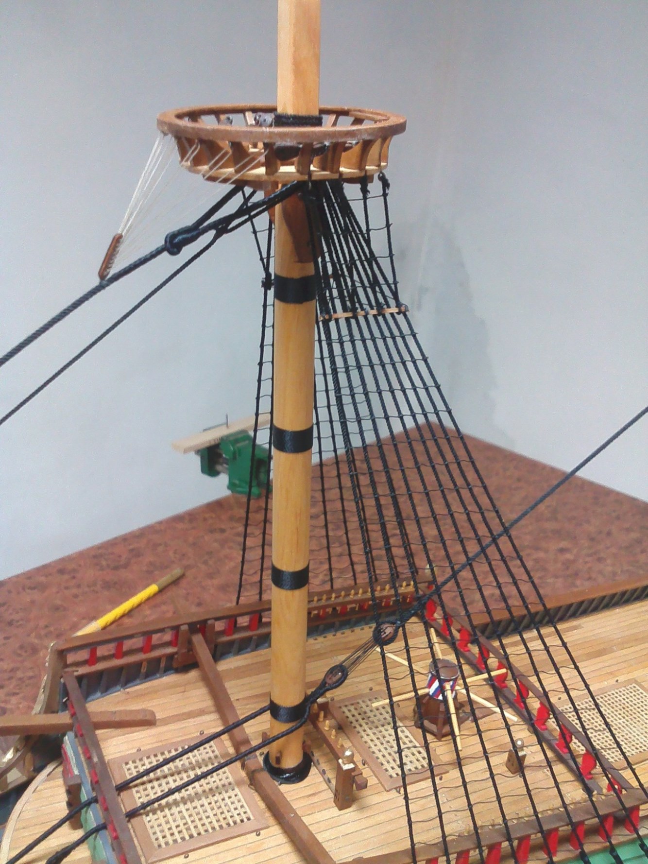 Witam. Prace przy olinowaniu stałym dobiegły końca. Było trochę problemów z odpowiednim naprężeniem głównie want. Niestety liny z nici poliestrowych zachowują się różnie w zależności od temperatury i wilgotności otoczenia. Nie wiem, jak to wygląda w przypadku lin bawełnianych, bo dotąd ich nie używałem. Parę zdjęć:
