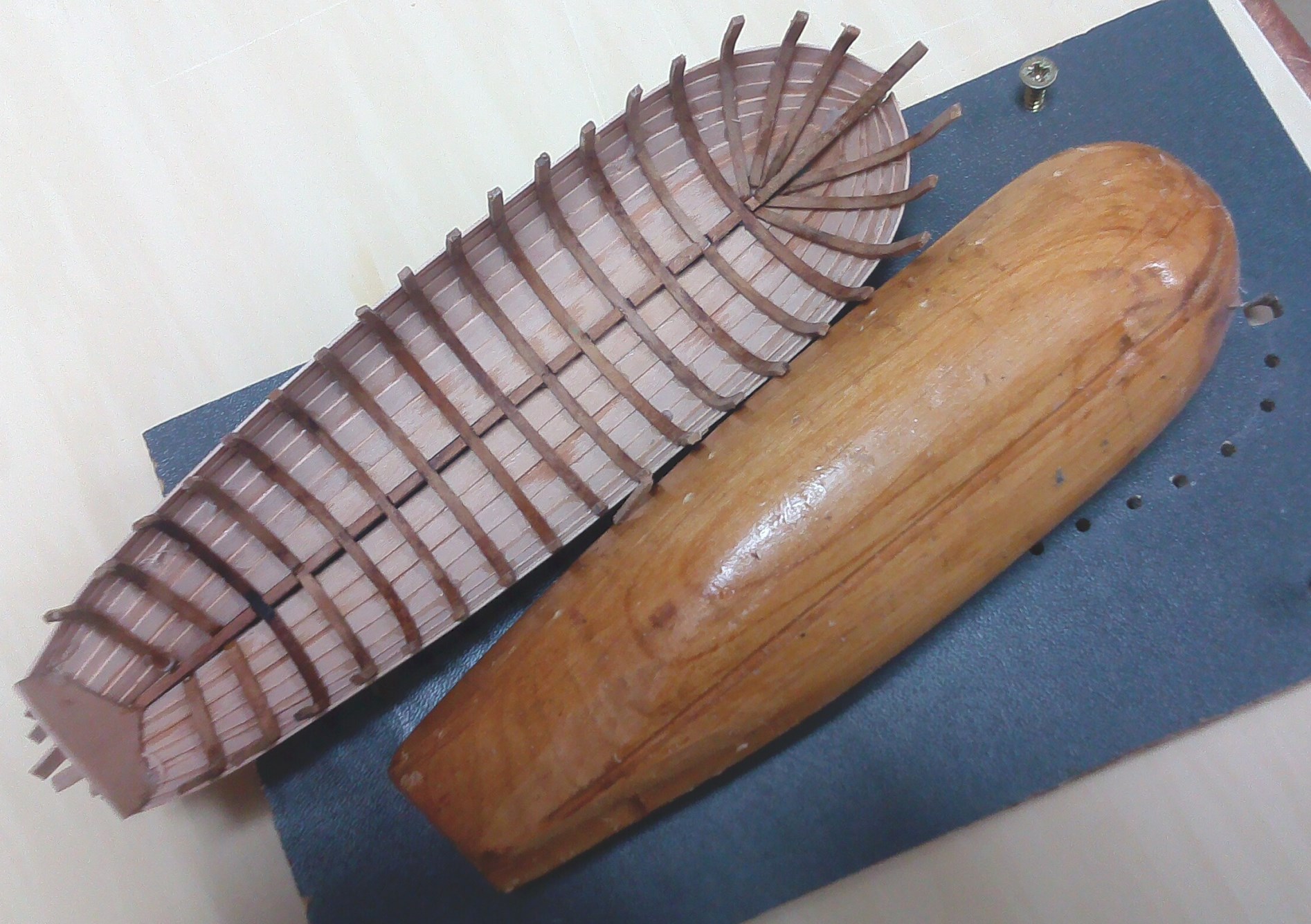 Skorupa łodzi, świeżo wyjęta z kopyta. Pierwszy raz robiłem tą metodą i bałem się, że nie oddzielę formy od łodzi, ale jakoś się udało. Wcześniej szalupy wykonywałem na jednorazowych kopytach z kartonu.
