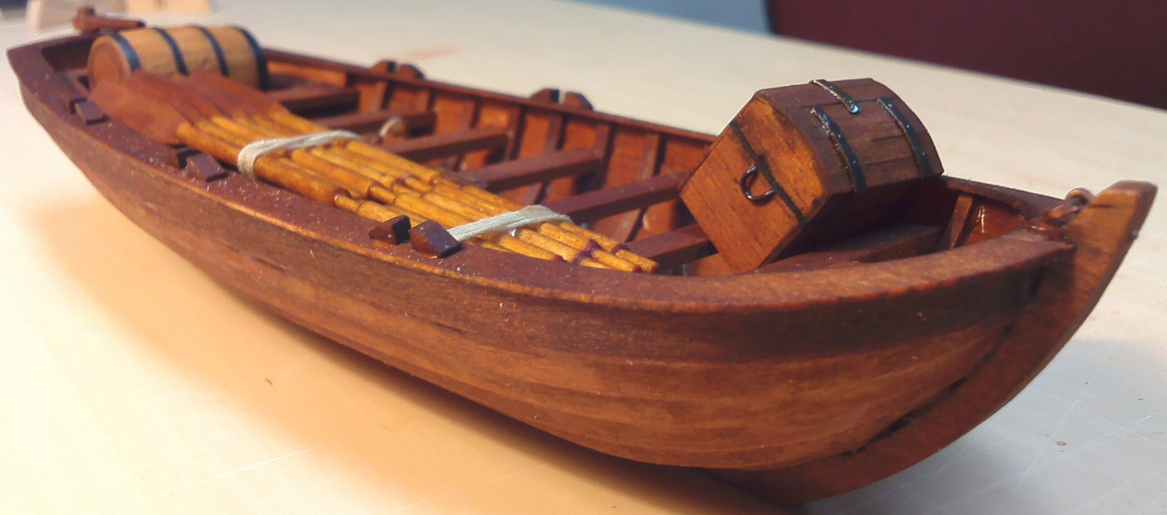Tymczasem powstała łódź:Na wyposażeniu wiosła, beczka na rum, wiadro na wodę, i pobudzająca wyobraźnię laików wychowanych na "Piratach z Karaibów", skrzynia na kosztowności.