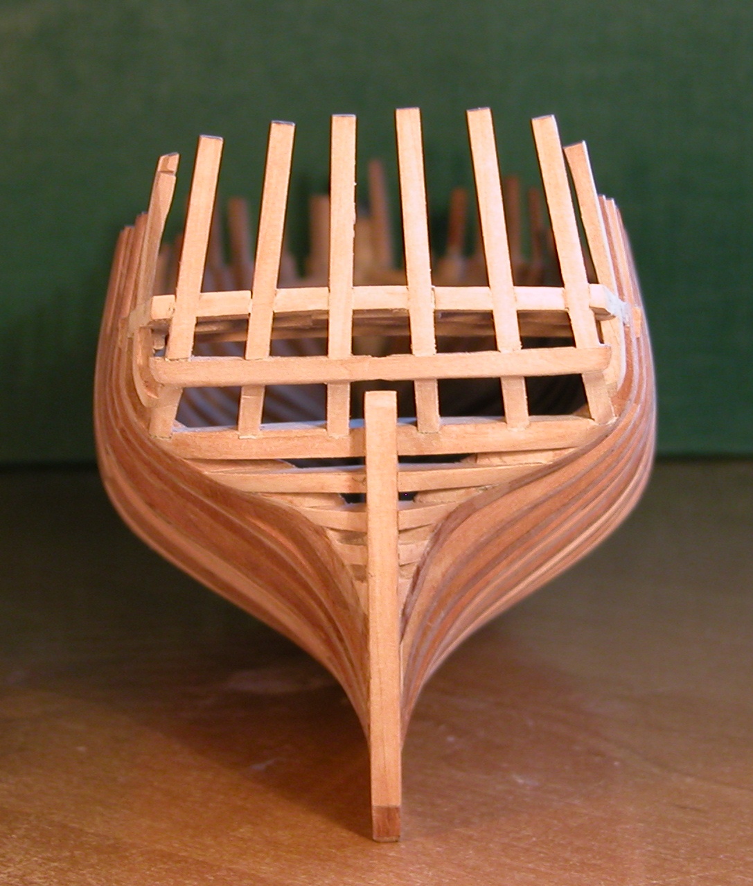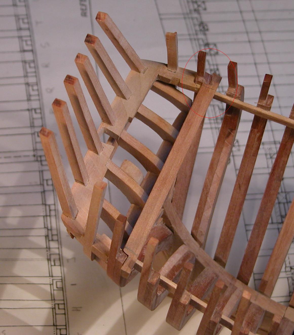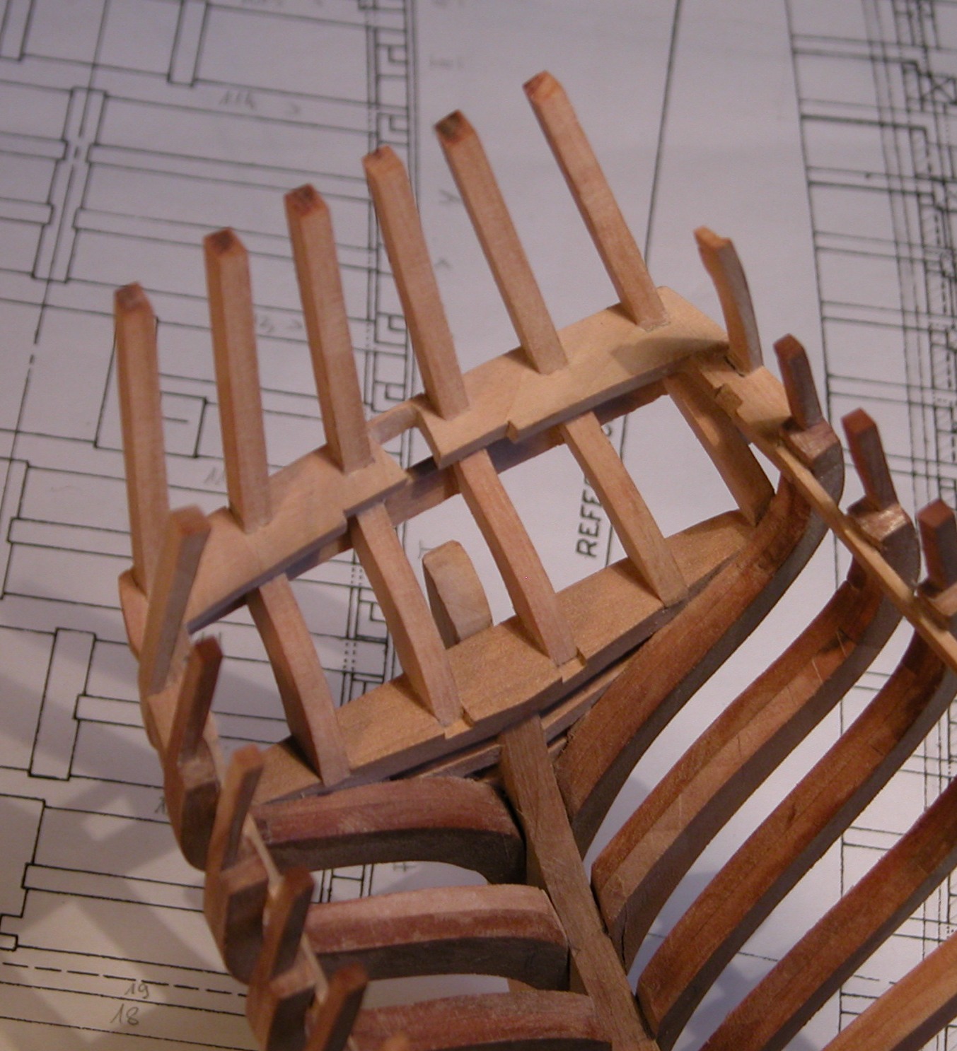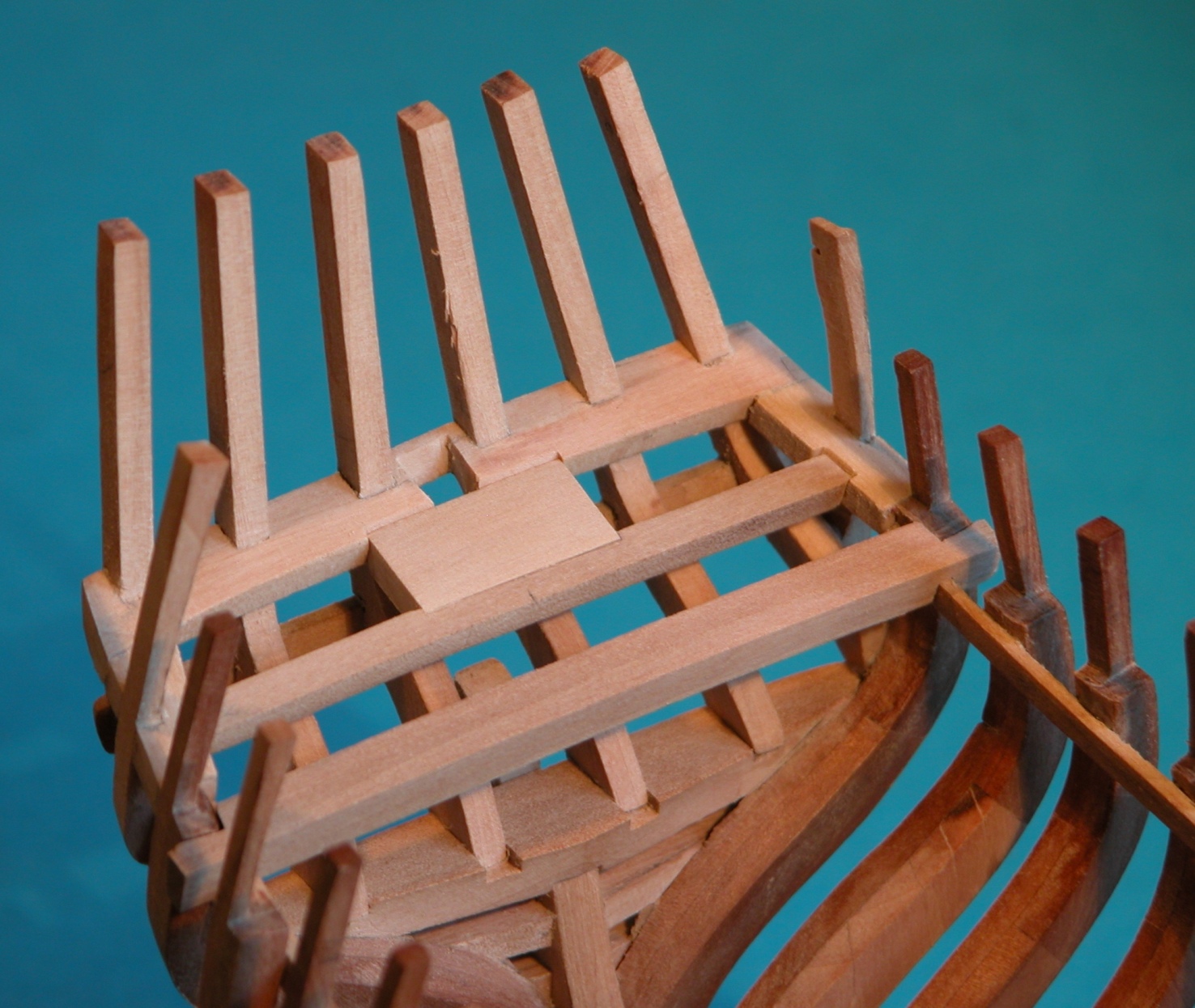 Zadowolony z siebie zacząłem docinać pierwsze pokładniki (wcześniej wygięte zgodnie z szablonem). I po włożeniu na miejsce pierwszego (póki co na sucho) samozadowolenie prysło jak bańka mydlana. Okazało się, że nie tylko głupi jestem jak but, ale i planów czytać nie potrafię – poprzeczkę usztywniającą żebra pawęży (która jednocześnie pełni rolę najbliższego rufy pokładnika) zamocowałem bowiem na wysokości (a właściwie na przedłużeniu) listwy, na której będą opierać się pokładniki. Czyli o ok. 2 mm za nisko.