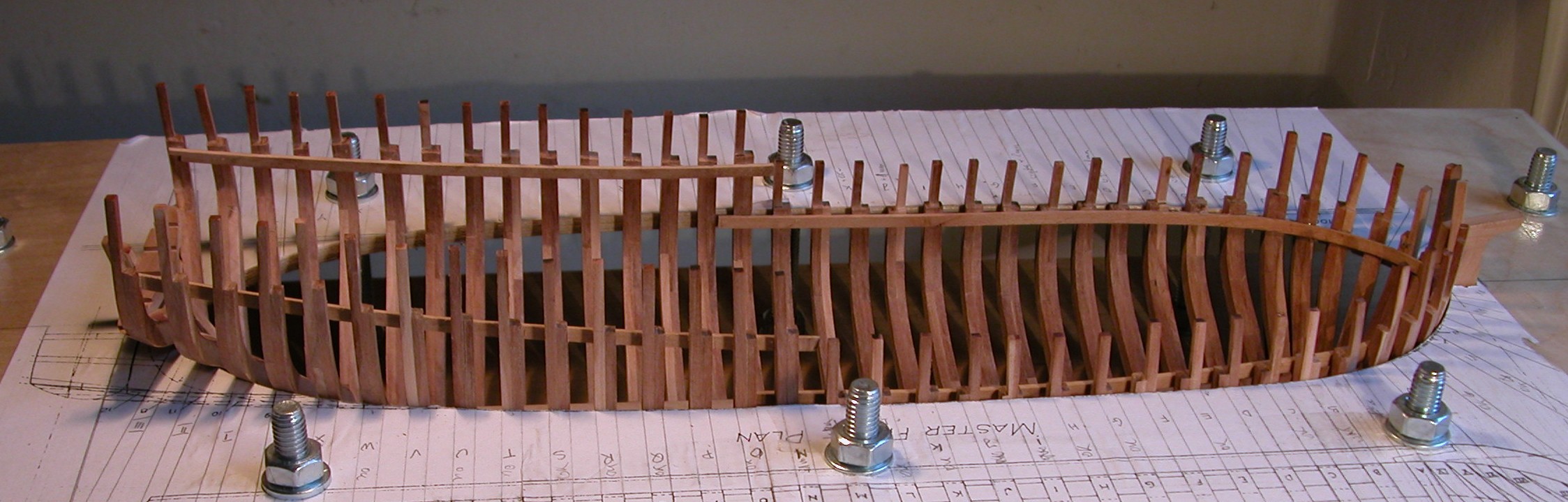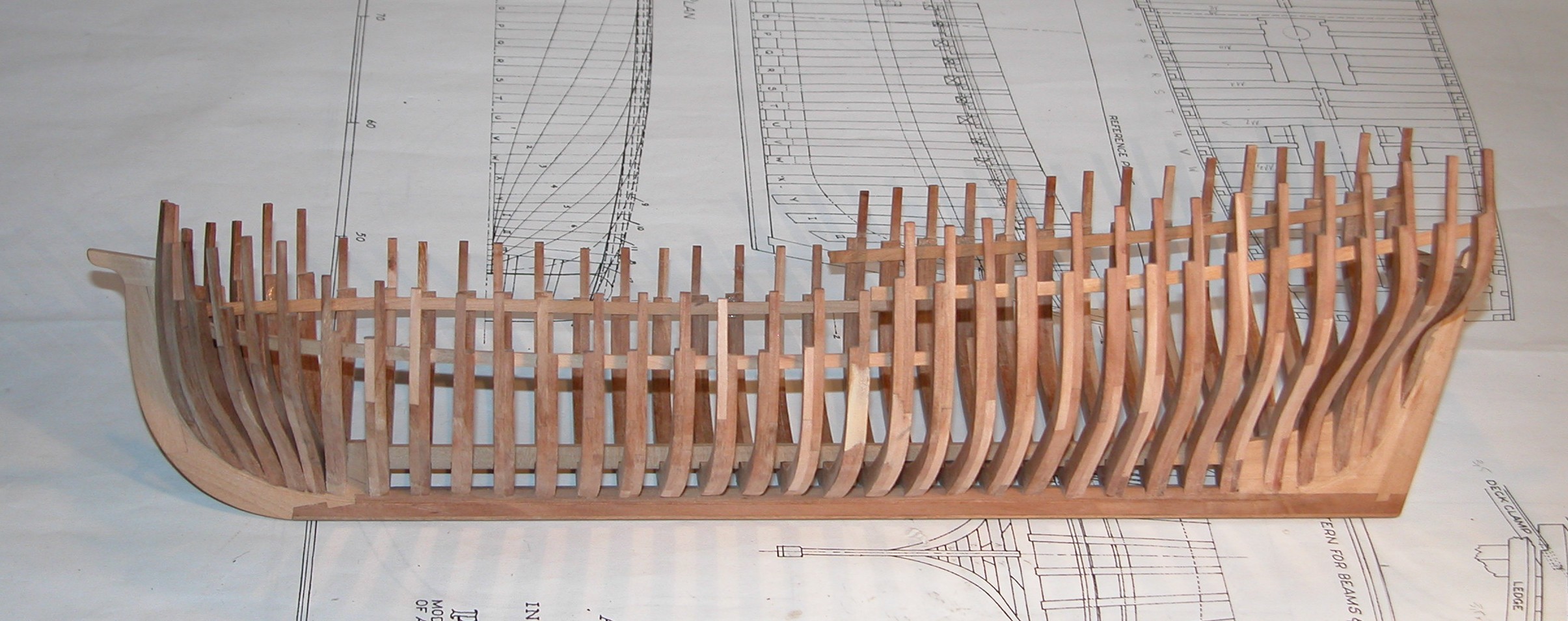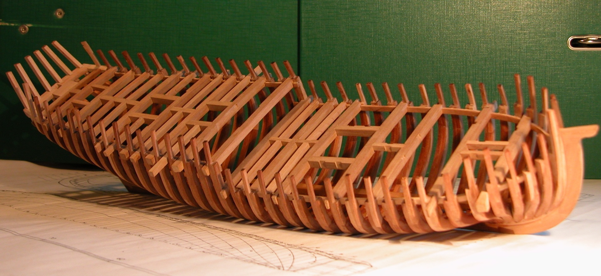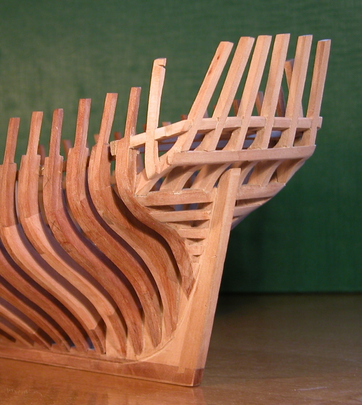 Zadowolony z siebie zacząłem docinać pierwsze pokładniki (wcześniej wygięte zgodnie z szablonem). I po włożeniu na miejsce pierwszego (póki co na sucho) samozadowolenie prysło jak bańka mydlana. Okazało się, że nie tylko głupi jestem jak but, ale i planów czytać nie potrafię – poprzeczkę usztywniającą żebra pawęży (która jednocześnie pełni rolę najbliższego rufy pokładnika) zamocowałem bowiem na wysokości (a właściwie na przedłużeniu) listwy, na której będą opierać się pokładniki. Czyli o ok. 2 mm za nisko.