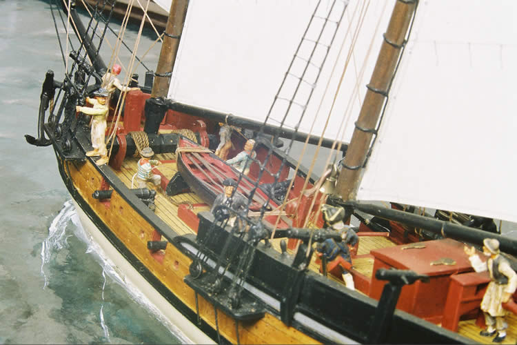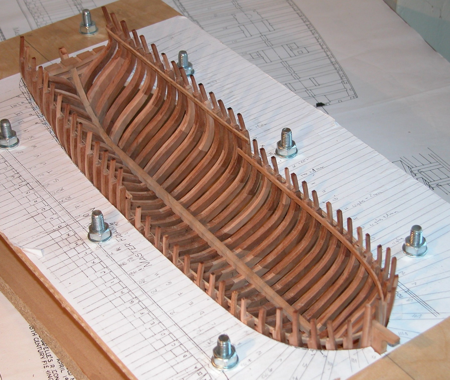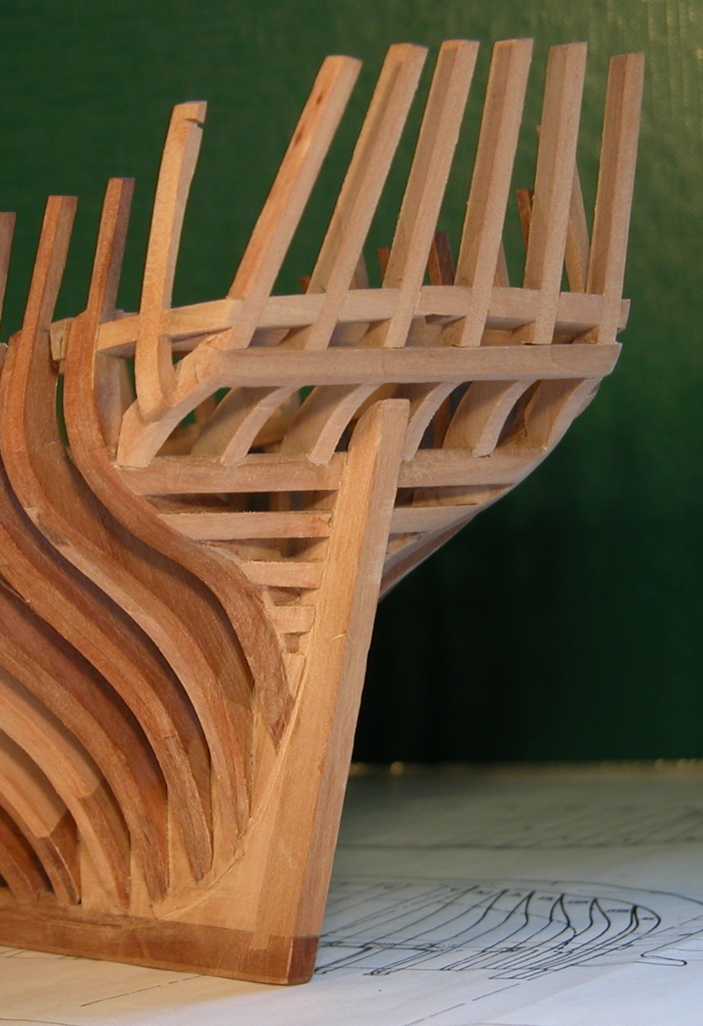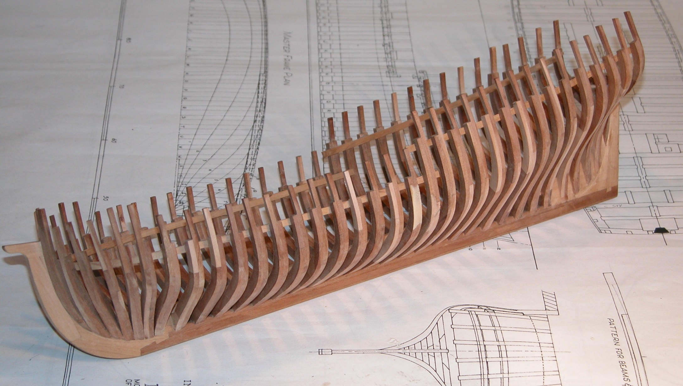 Zadowolony z siebie zacząłem docinać pierwsze pokładniki (wcześniej wygięte zgodnie z szablonem). I po włożeniu na miejsce pierwszego (póki co na sucho) samozadowolenie prysło jak bańka mydlana. Okazało się, że nie tylko głupi jestem jak but, ale i planów czytać nie potrafię – poprzeczkę usztywniającą żebra pawęży (która jednocześnie pełni rolę najbliższego rufy pokładnika) zamocowałem bowiem na wysokości (a właściwie na przedłużeniu) listwy, na której będą opierać się pokładniki. Czyli o ok. 2 mm za nisko.