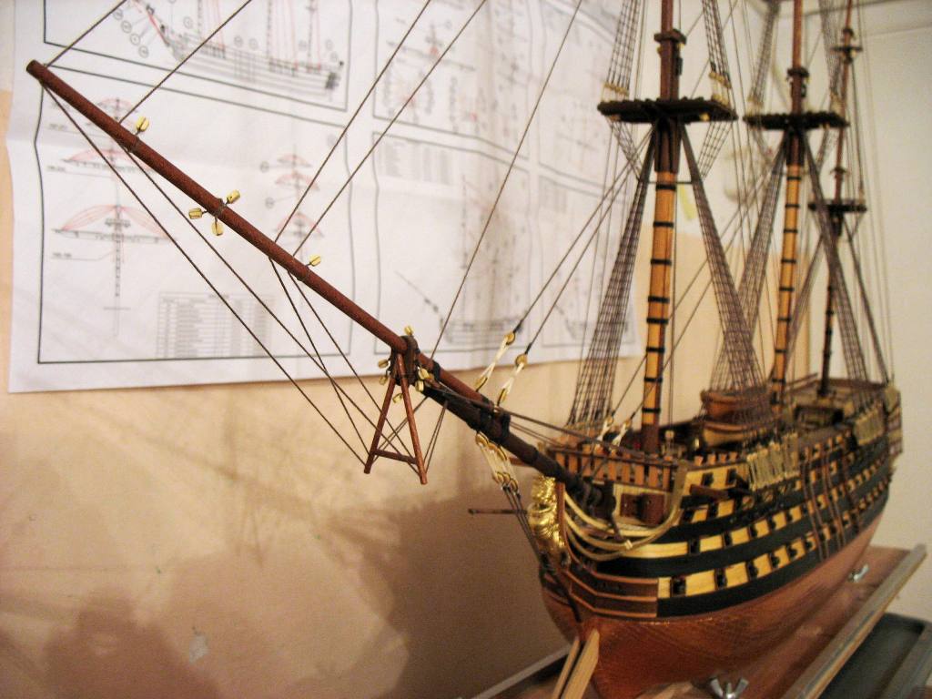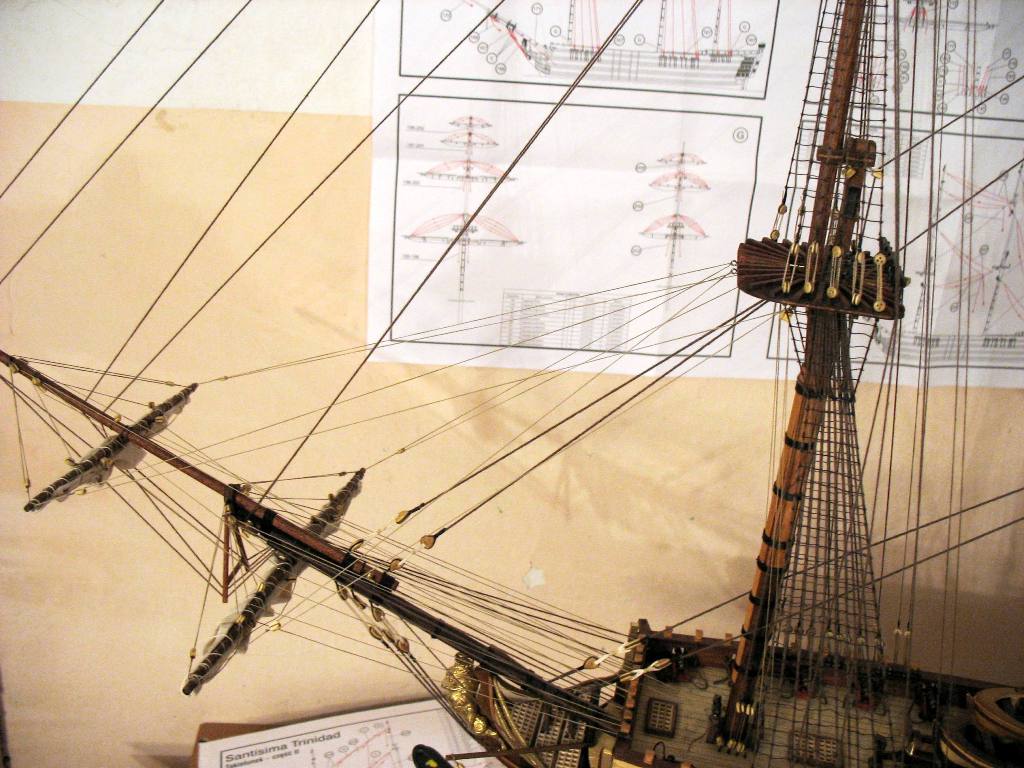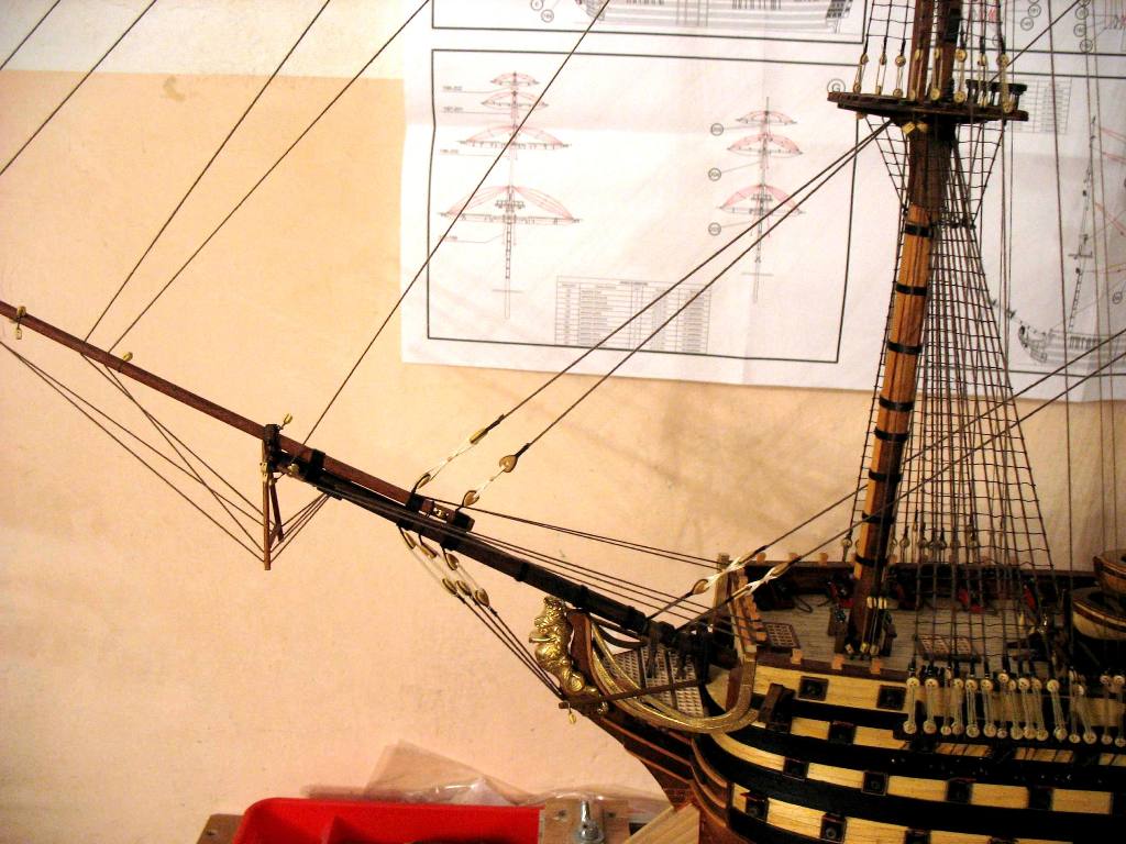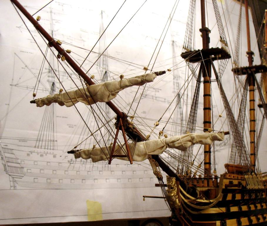 Reje zmontowałem wiec zaczynam je wieszać razem z żagielkami a żagielki będą zwinięte . Robię to w ten sposób, że wieszam żagle tak jak by były rozwinięte a następnie ściągam linkami zgodnie ze sztuką jak to robiona faktycznie co pozwala na zachowanie wszystkich linek jakie były montowane przy żaglach a na koniec związuje ale delikatnie długą reflinką co by nie były takie mocno ściągnięte i można je było uformować