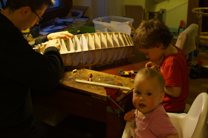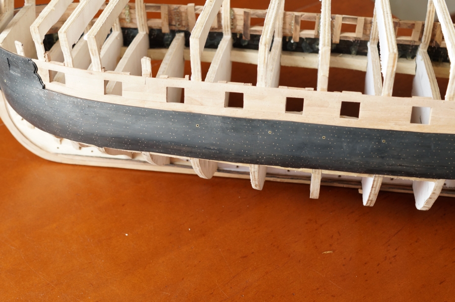 Witam. Po rocznej przerwie zw. z narodzinami kolejnego bobasa, jakiś czas temu wznowiłem pracę nad statkiem. Na pierwszy ogień poszło skończenie poszycia i przybicie wszystkich gwoździ w poszyciu. Uff...