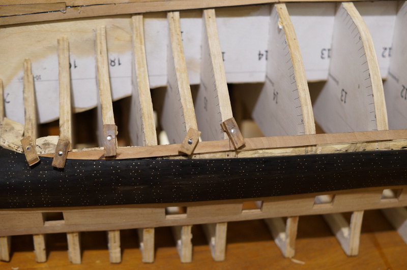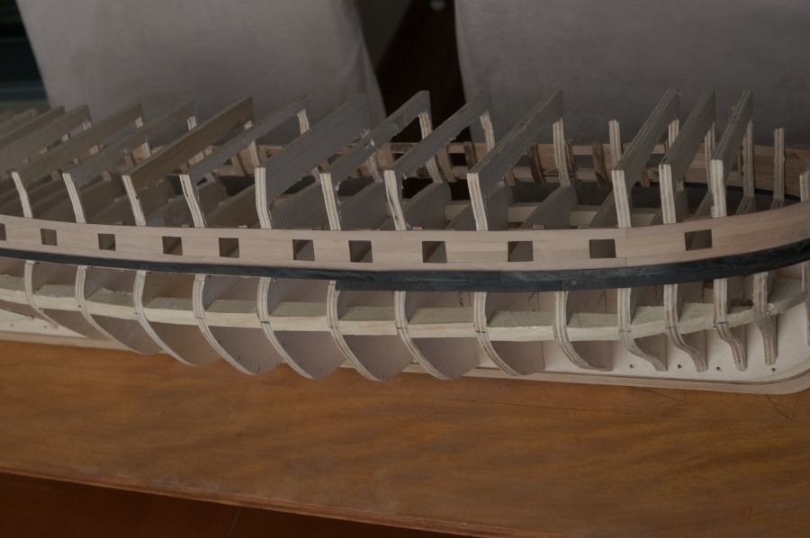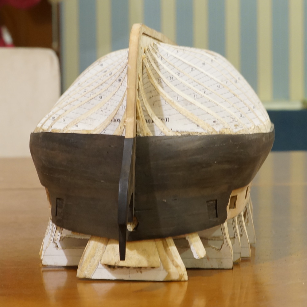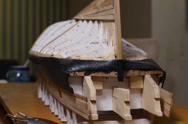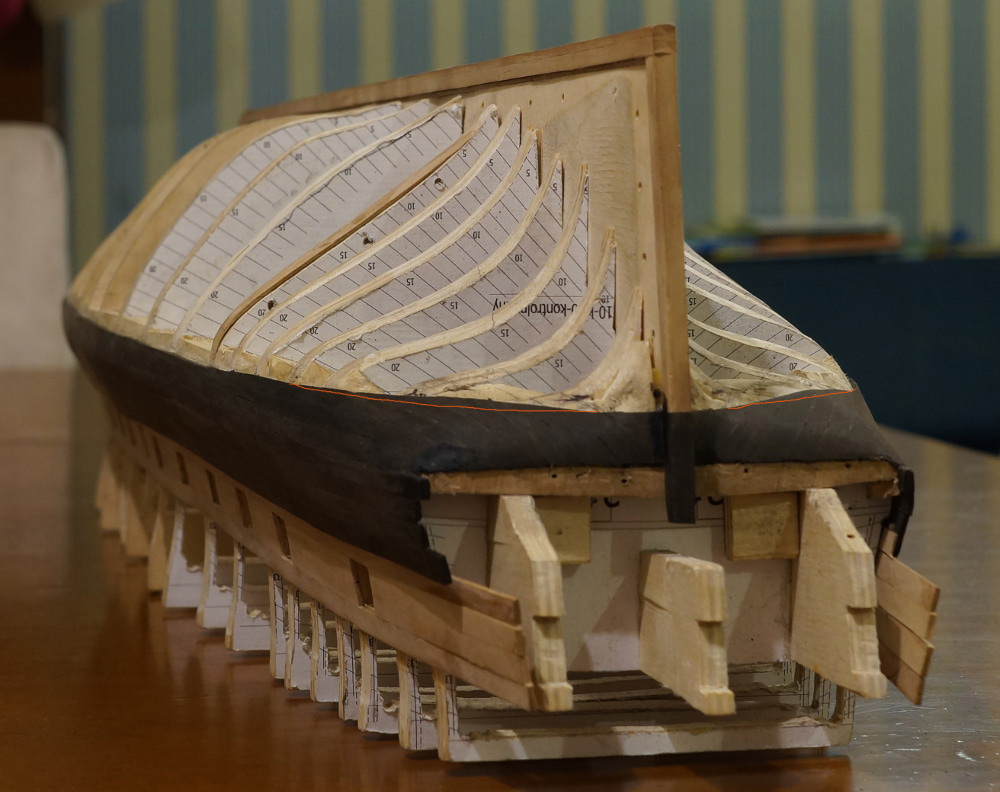 Powolutku... Musiałem porobić trochę korekt na wręgach, a kilka niestety wyciąć powyżej głównego pokładu. Powklejałem klocki na linii wody, gdzie będzie zmiana gatunku drewna, oraz na rufie. No i pierwsze planki wyznaczające z grubsza przebieg furt działowych.