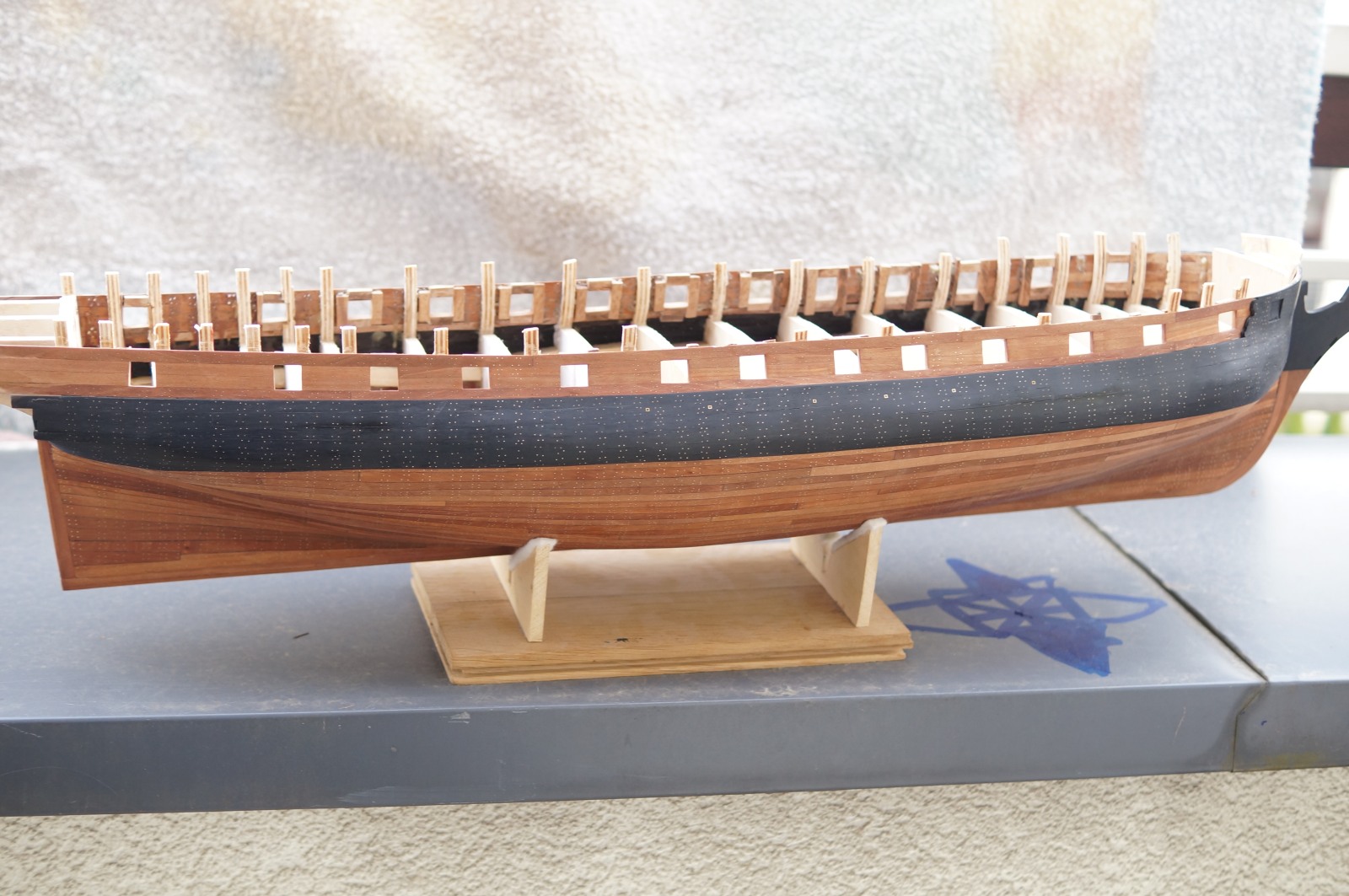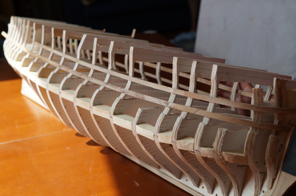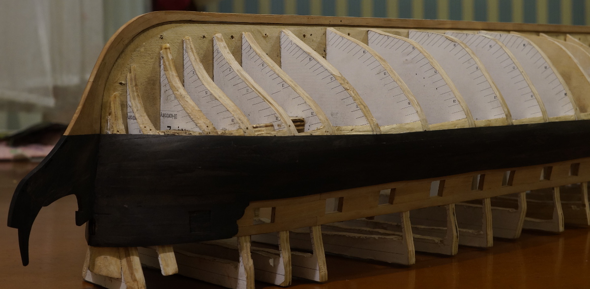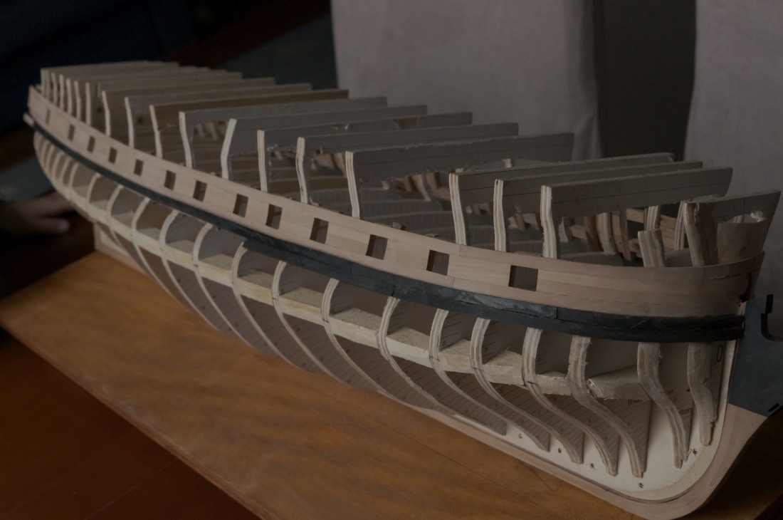 Powolutku... Musiałem porobić trochę korekt na wręgach, a kilka niestety wyciąć powyżej głównego pokładu. Powklejałem klocki na linii wody, gdzie będzie zmiana gatunku drewna, oraz na rufie. No i pierwsze planki wyznaczające z grubsza przebieg furt działowych.