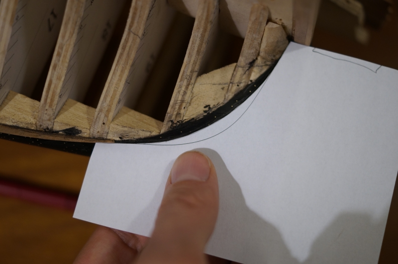 Zanim zaczniesz dalsze poszywanie kalduba plankami ponizej linii wodnej, wyrownaj bieg dolnej krawedzi odbojnikow w odcinku rufowym aby byl bardziej plynny, bez tych zafalowan (jak zaznaczylem na fotce), bo to potem bedzie widoczne i niemozliwe do skorygowania bez zrywania calego poszycia.
