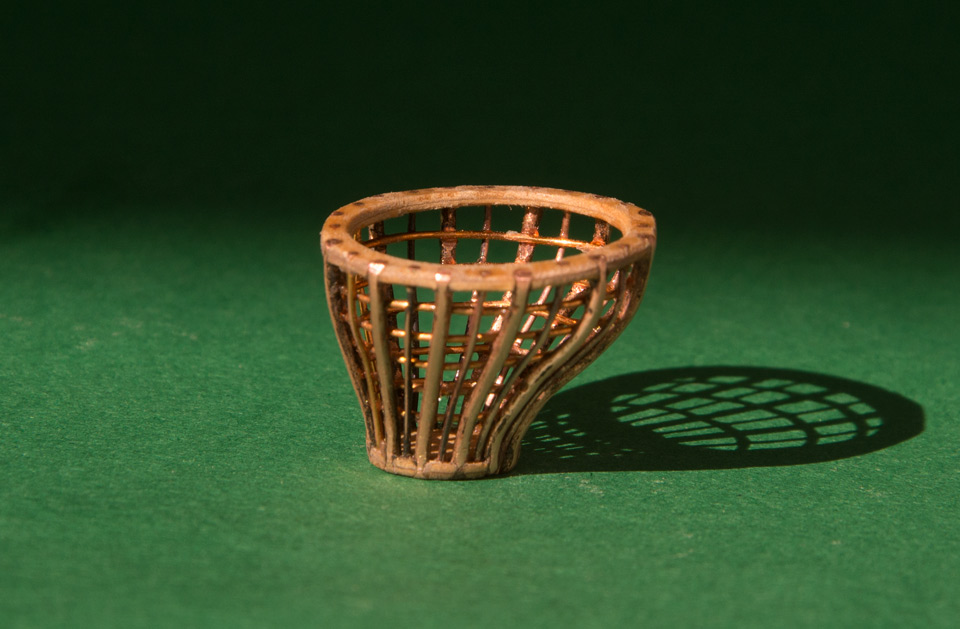 Następnie w podstawie i górnej obręczy wywierciłem kolejne otworki na środkowe elementy kratownicy z cieńszego drutu. W poziomych obręczach frezikiem naciąłem rowki i w poszczególne moduły wkleiłem druciki środkowych elementów kratownic. Po odcięciu i wyszlifowaniu nadałem końcowy kształt podstawie i górnej obręczy. Uzyskałem pierwszy element latarni KOSZ.