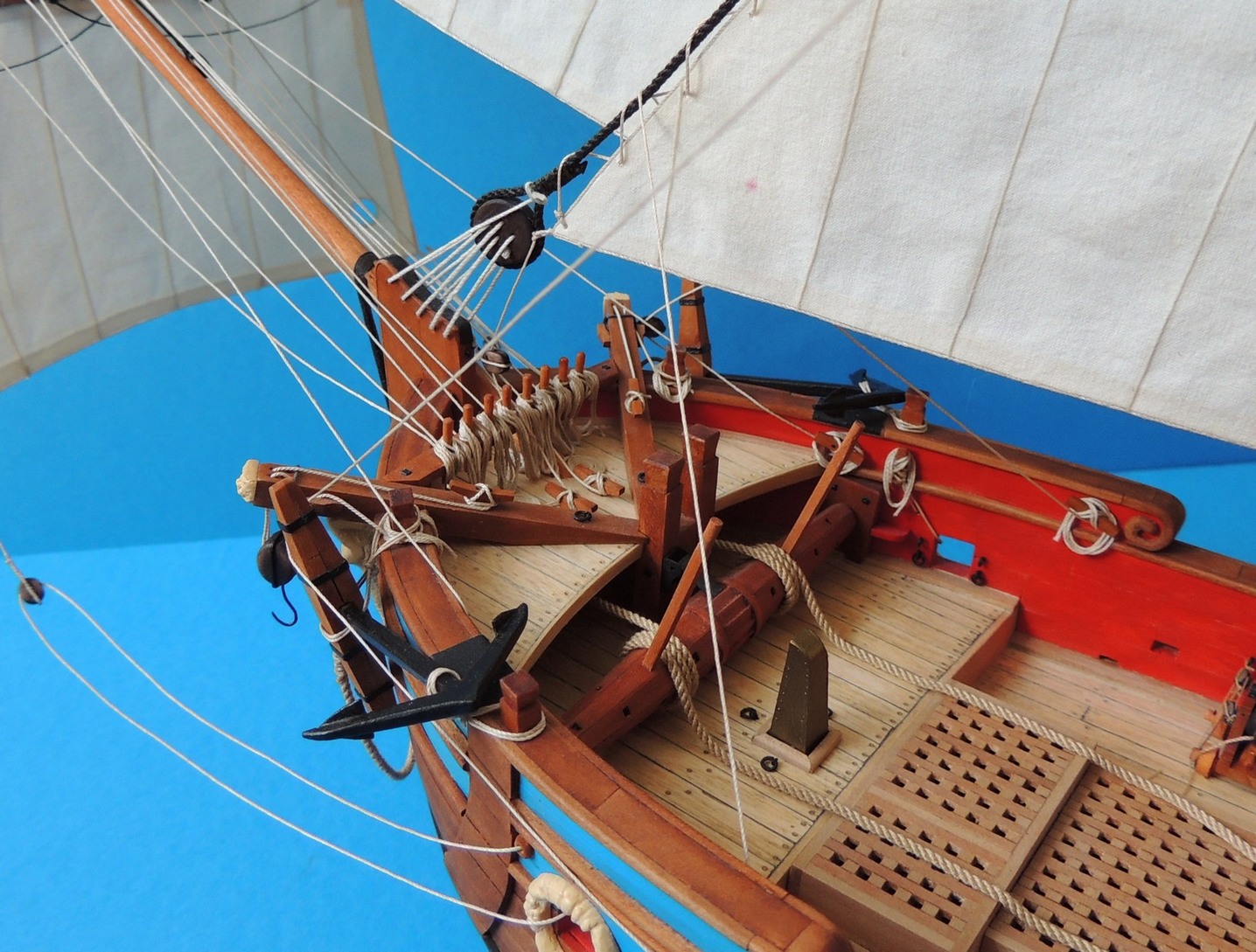 Następny żagielek zawieszony. Kotwice na swoim miejscu. Do windy kotwicznej dołożyłem dwa handszpaki. Przybywa bucht. Coraz większy uporządkowany bałagan