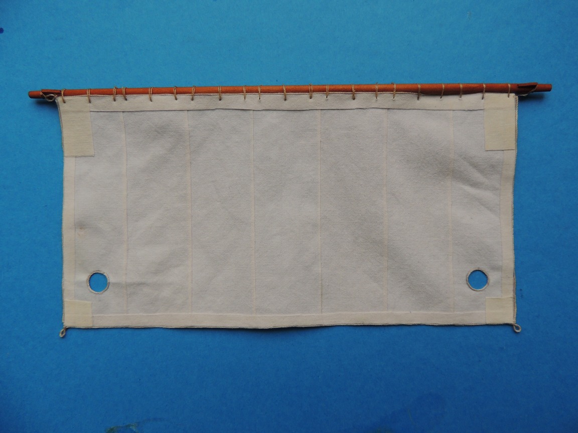 Tak na szybko, zrobiłem jeszcze jedną próbę wykonania żagla. Nitka naklejana na materiał, klejem do drewna. Dobrze się trzyma. Teraz muszę na coś się zdecydować.